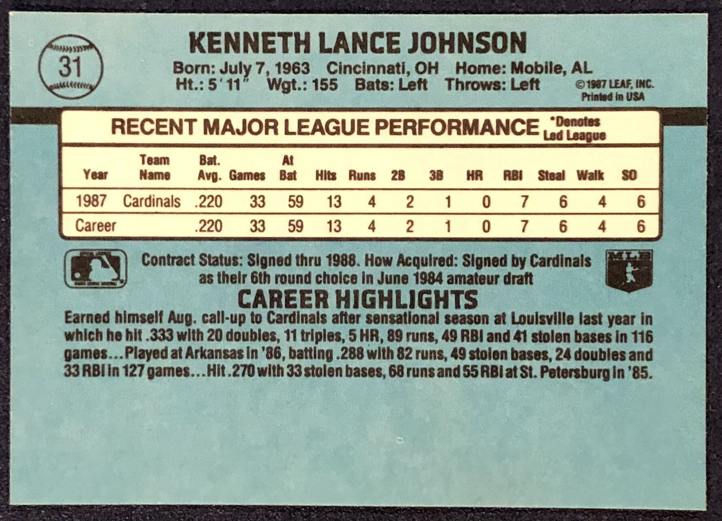 Lot 729 1988 DONRUSS LANCE JOHNSON ROOKIE CARD