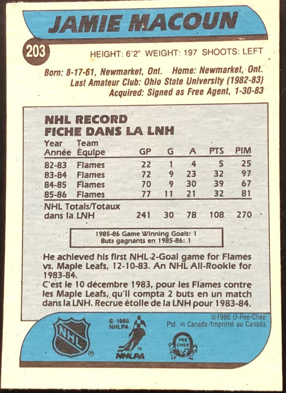 Lot 805 1986-87 O-PEE-CHEE JAMIE MACOUN