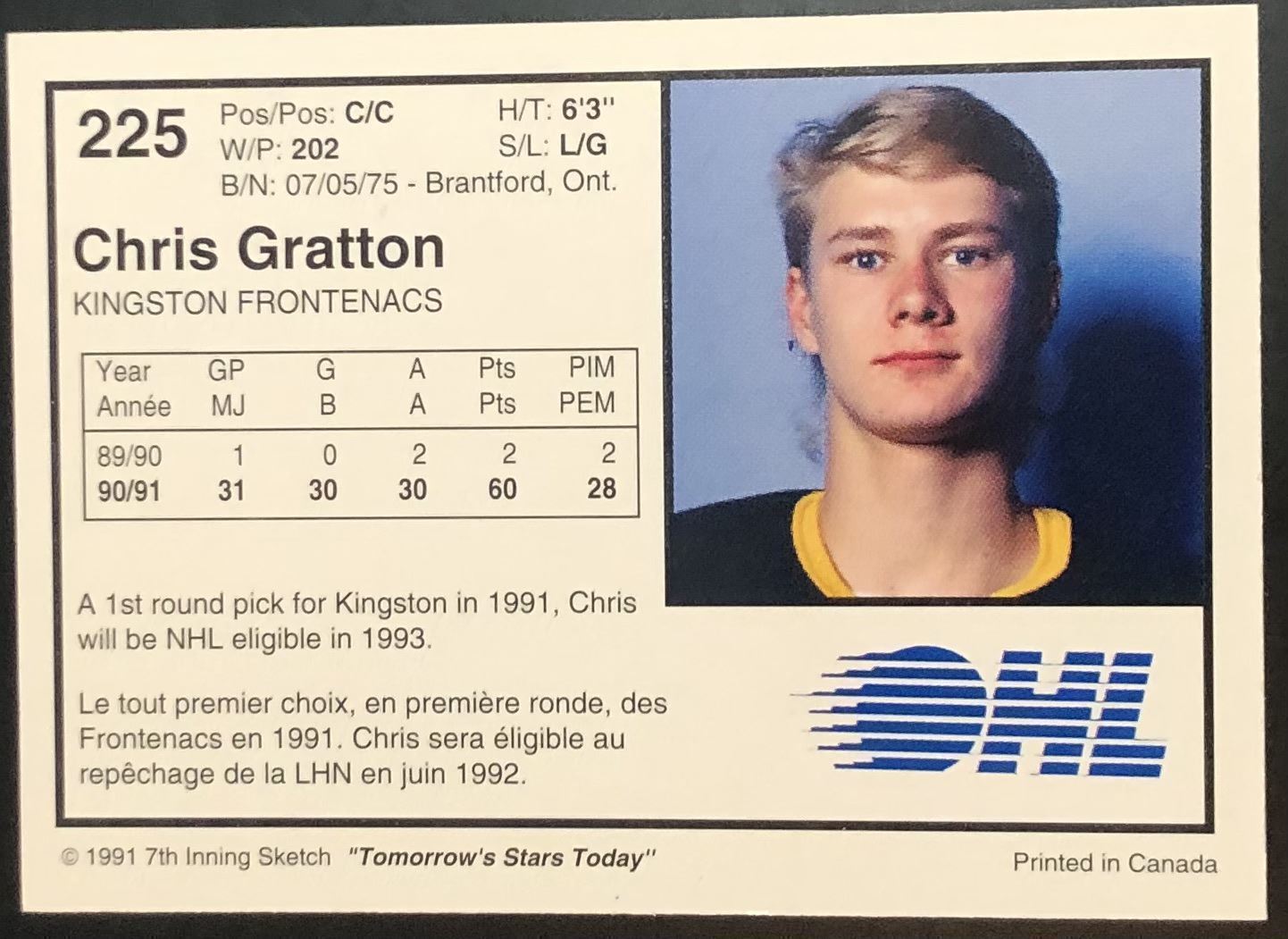 Lot 829 1991-92 KINGSTON FRONTENACS (OHL) - CHRIS GRATTON