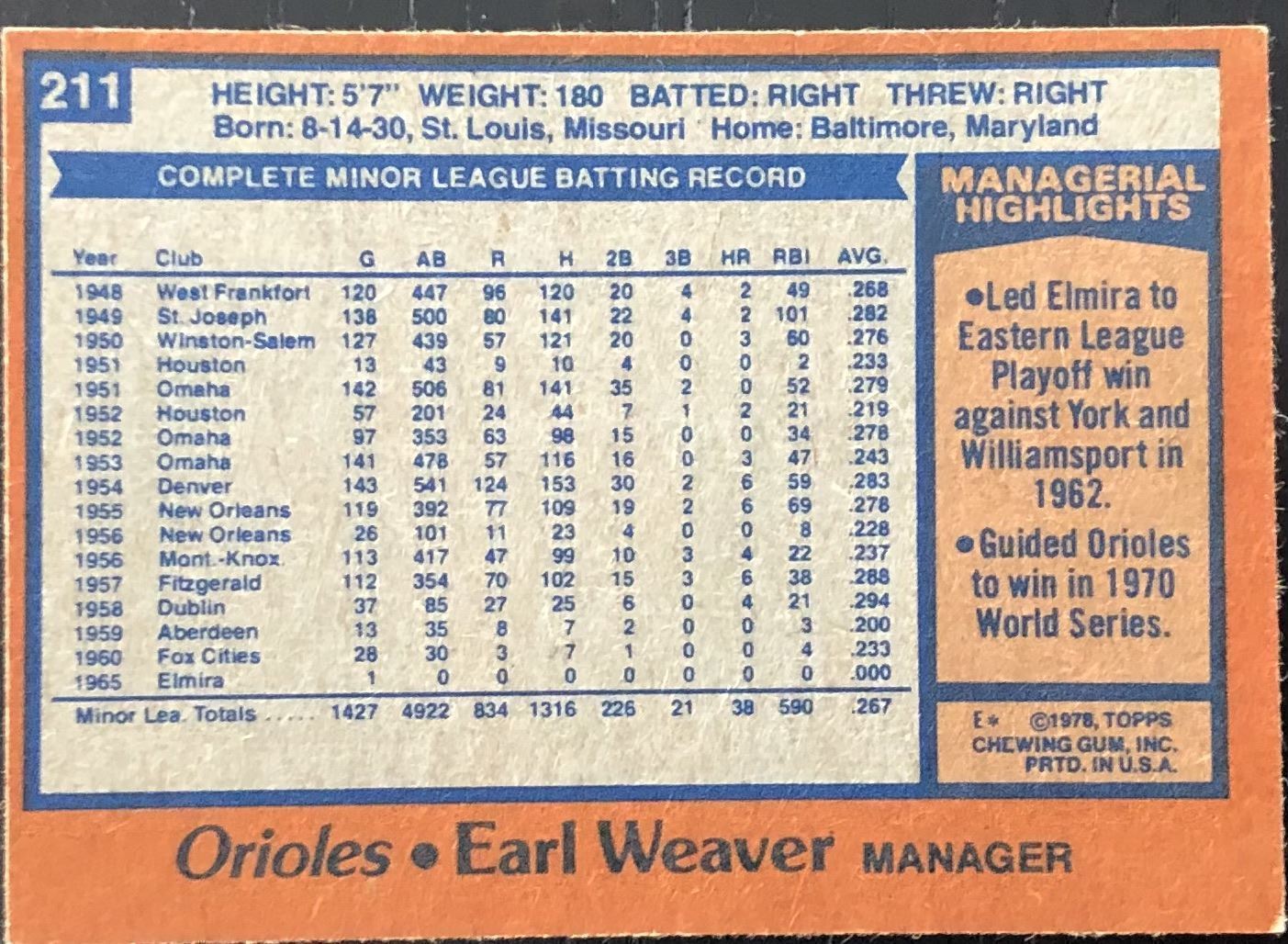 Lot 835 1978 TOPPS EARL WEAVER (HOF)