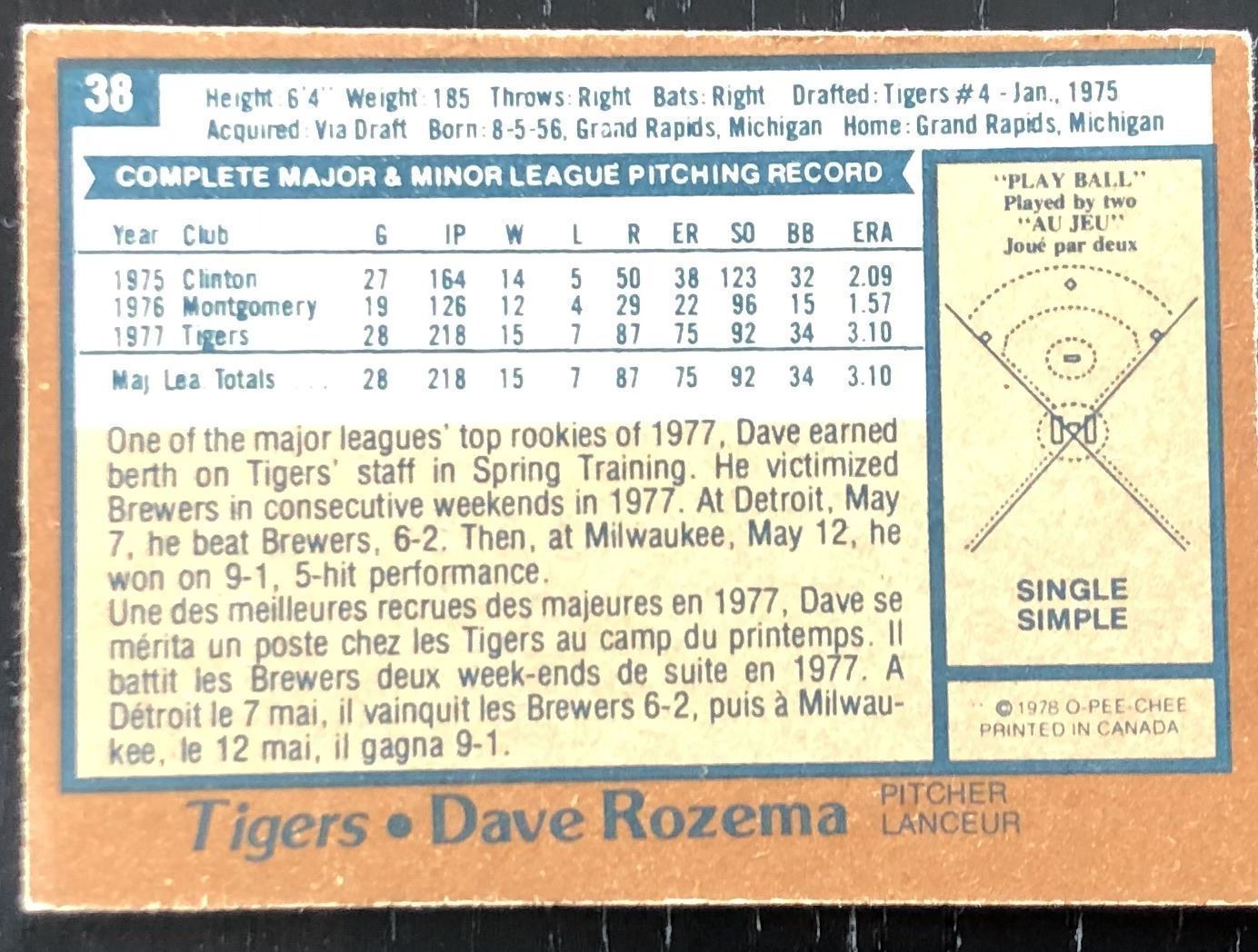 Lot 838 1978 O-PEE-CHEE DAVE ROZEMA ROOKIE CARD