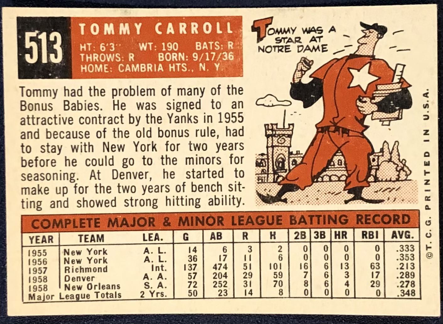 Lot 877 1959 TOPPS WHITE BACKS HIGH NUMBERS TOMMY CARROLL ROOKIE CARD