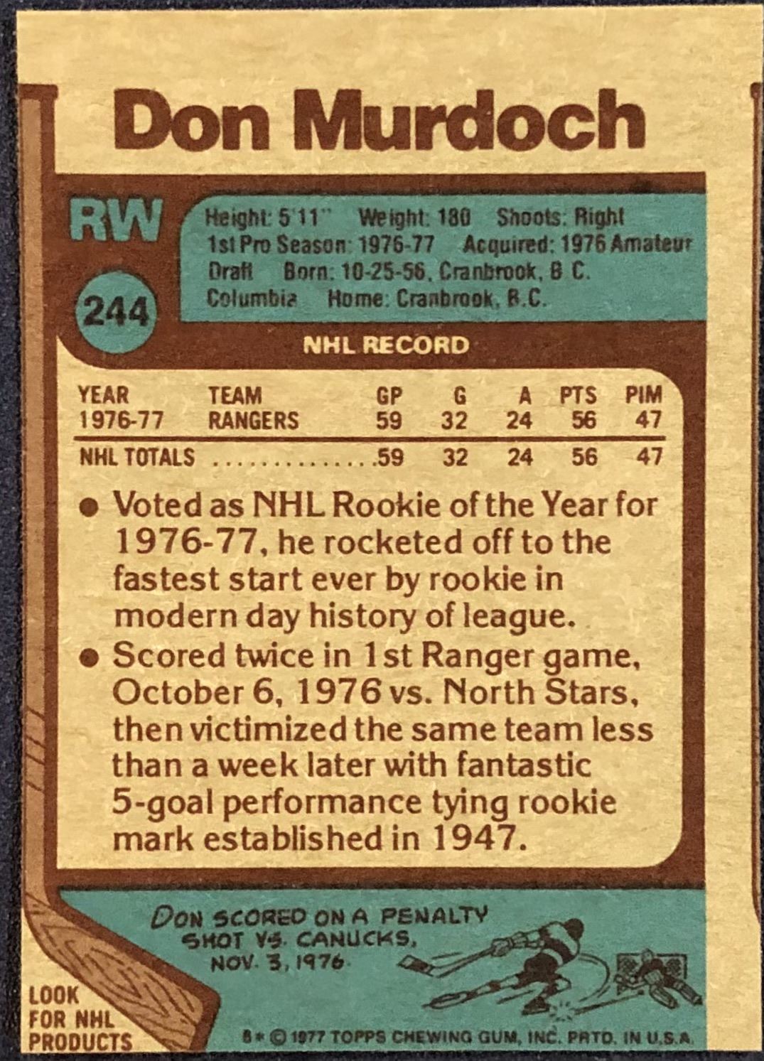 Lot 898 1977-78 TOPPS DON MURDOCH ROOKIE CARD