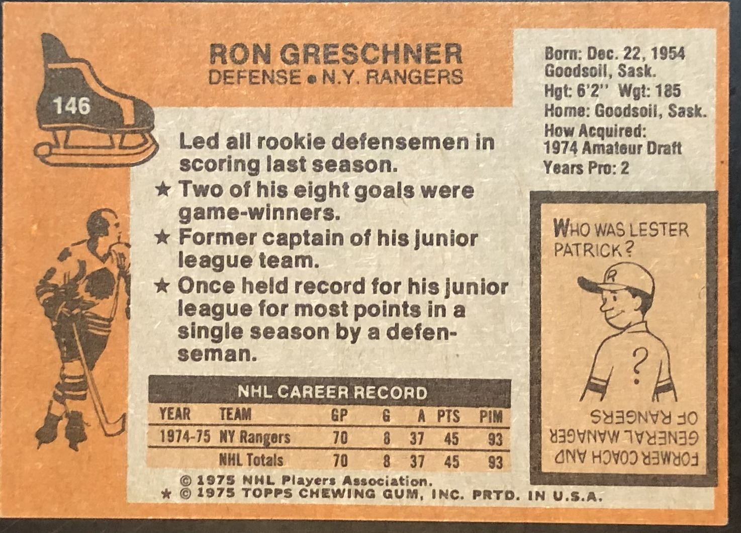 Lot 917 1975-76 NHL TOPPS RON GRESCHNER ROOKIE CARD
