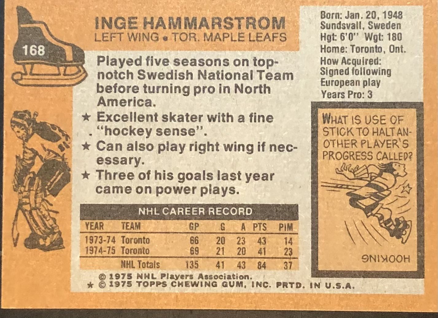 Lot 919 1975-76 NHL TOPPS INGE HAMMARSTROM
