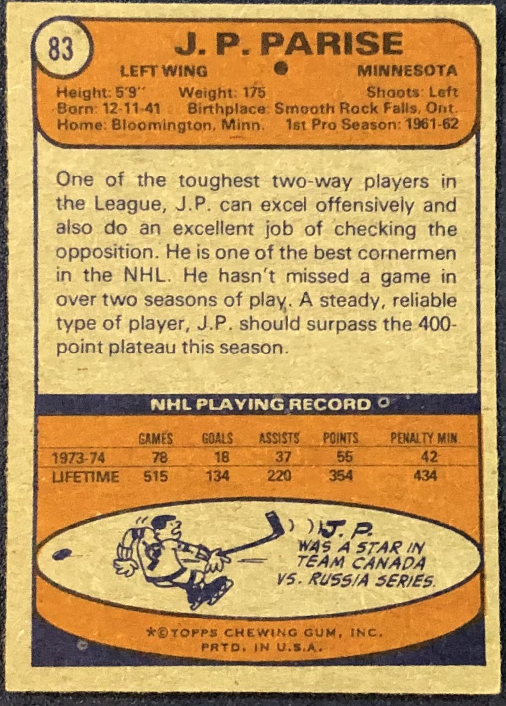 Lot 942 1974-75 TOPPS J.P. PARISE