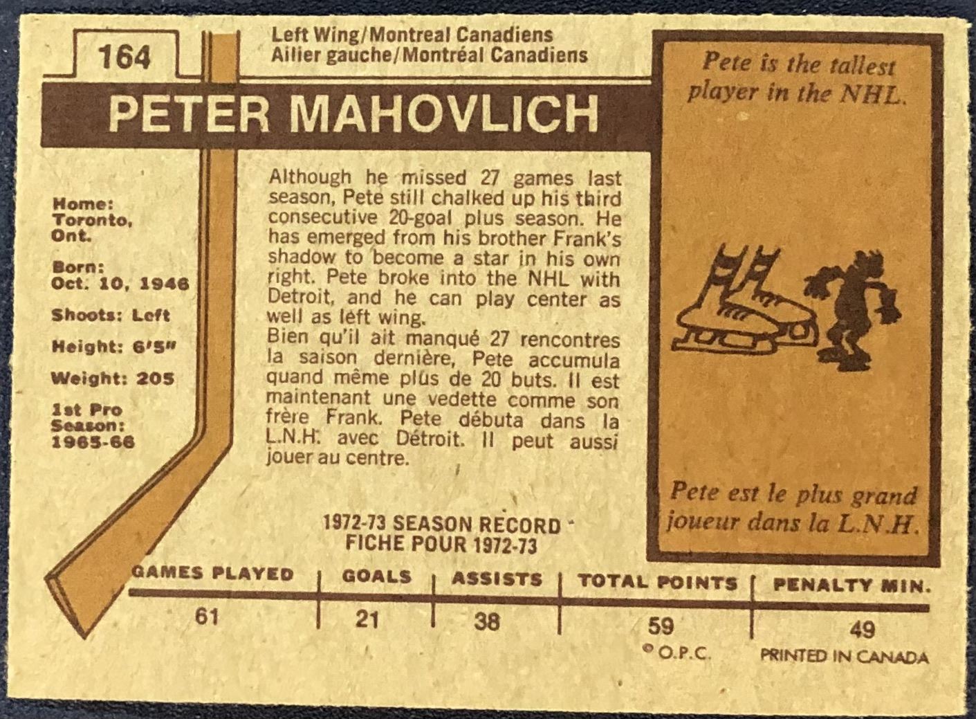 Lot 959 1973-74 TOPPS NHL PETE MAHOVLICH (HOF)