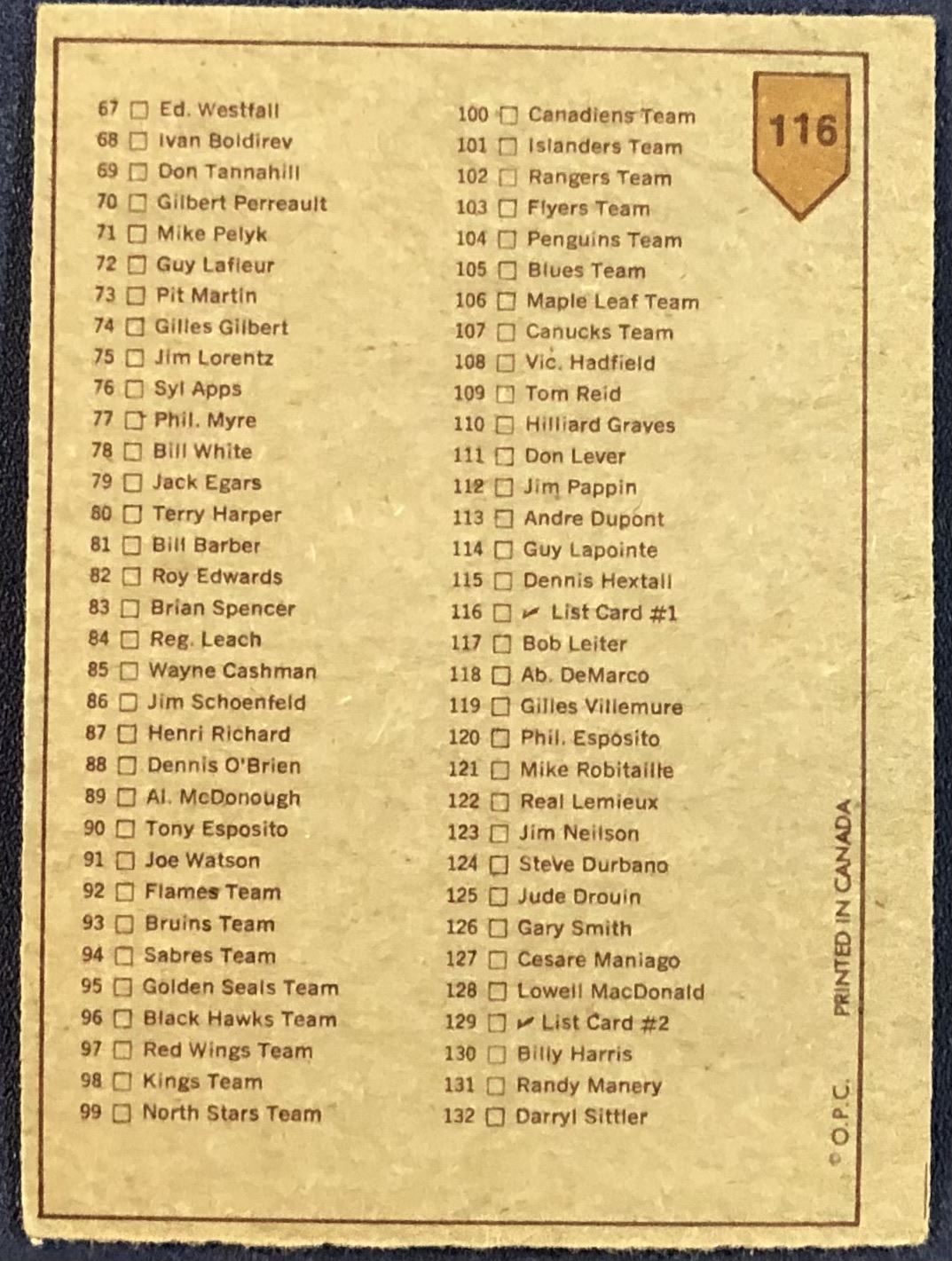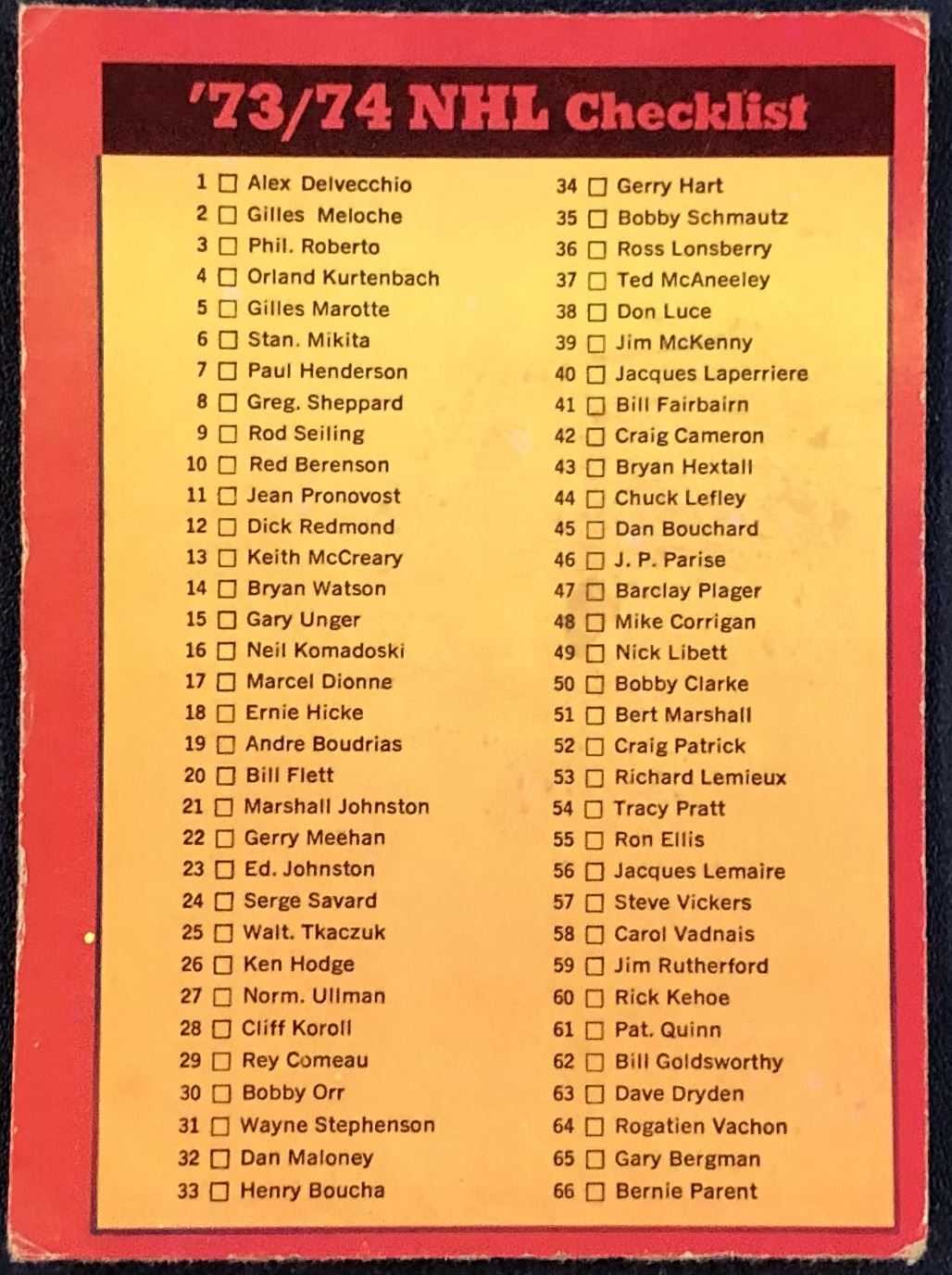 Lot 962 1973-74 TOPPS NHL CHECKLIST