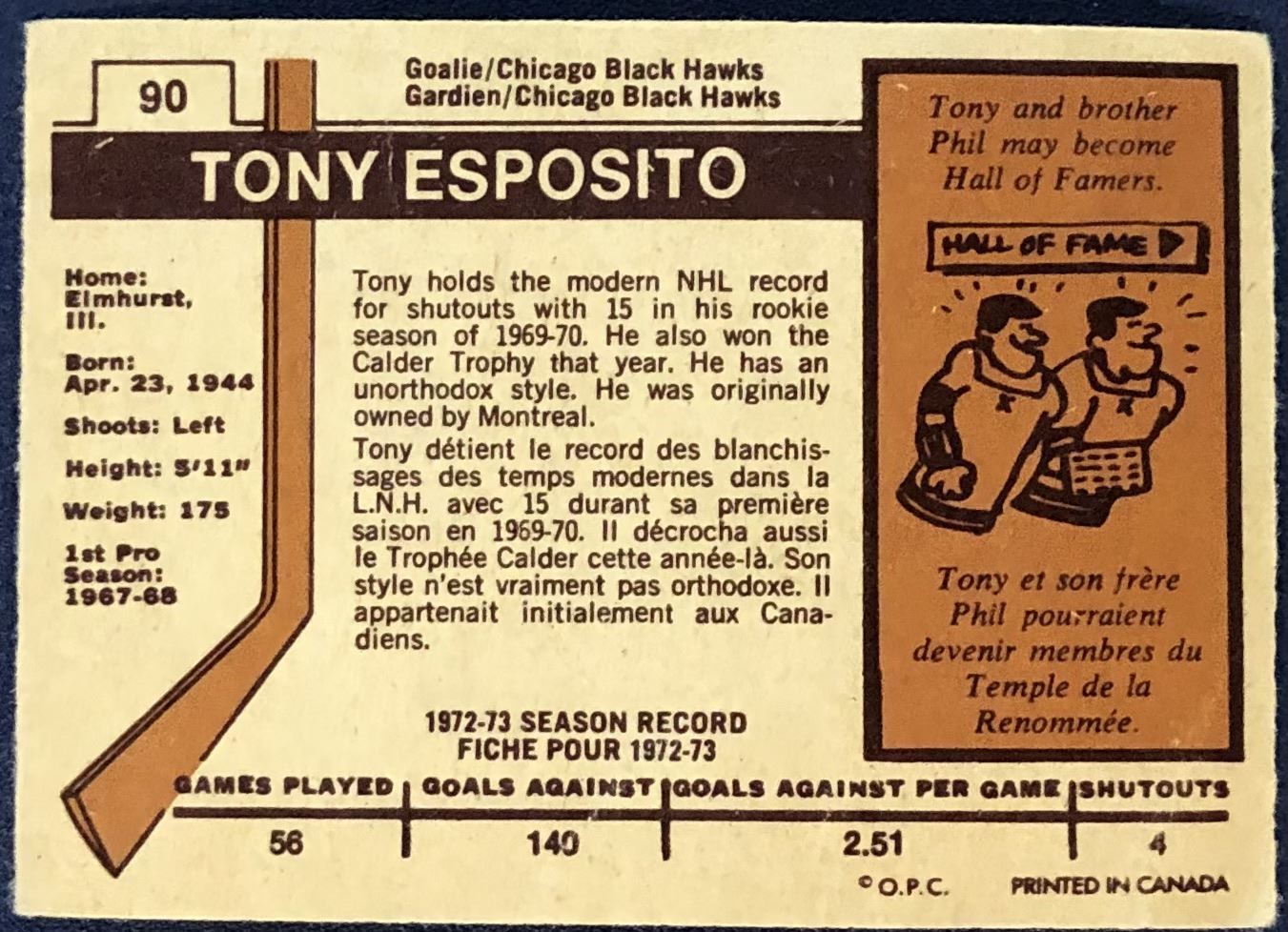 Lot 971 1973-74 O-PEE-CHEE NHL TONY ESPOSITO (HOF)