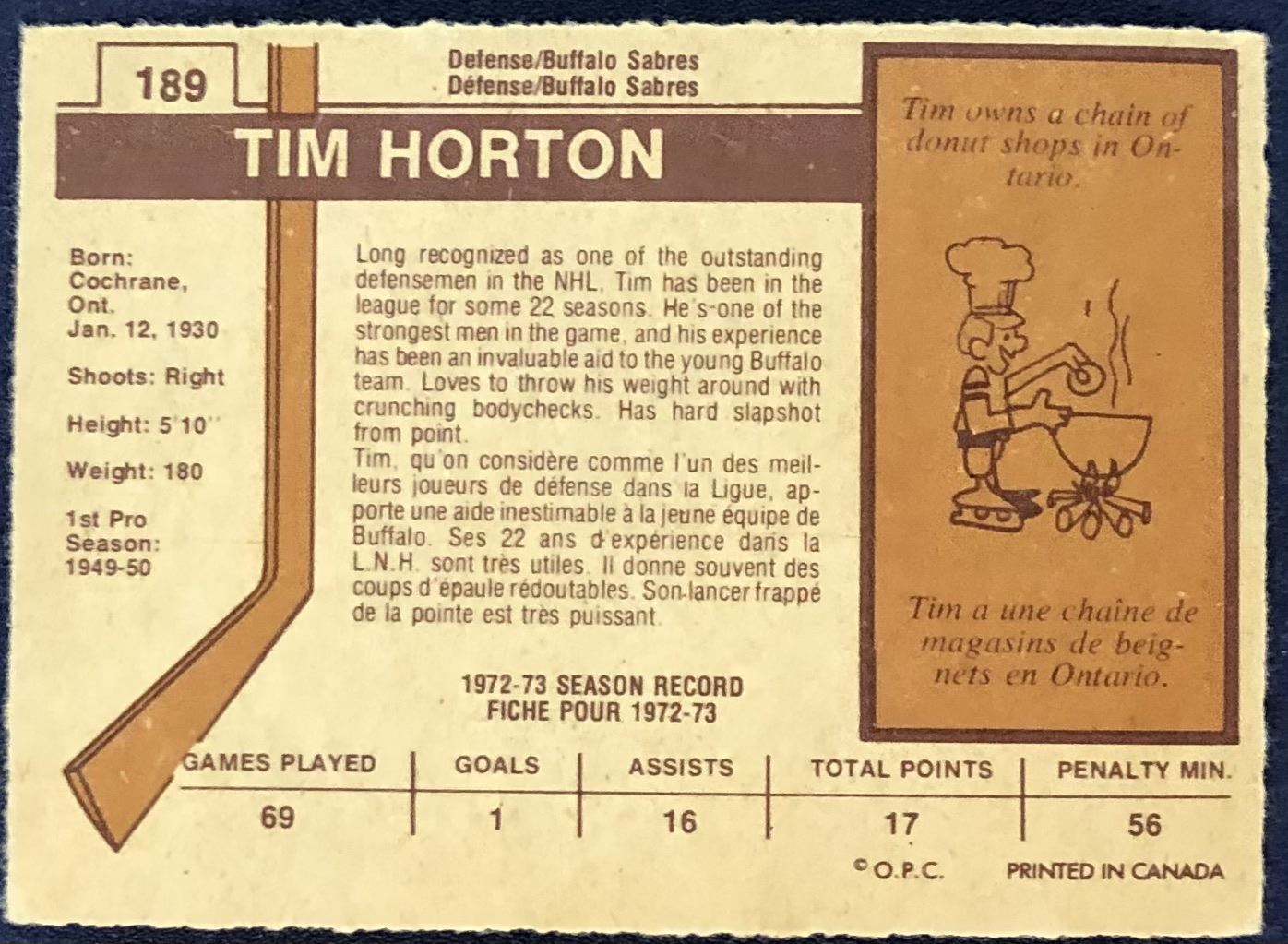 Lot 972 1973-74 O-PEE-CHEE NHL TIM HORTON (HOF)