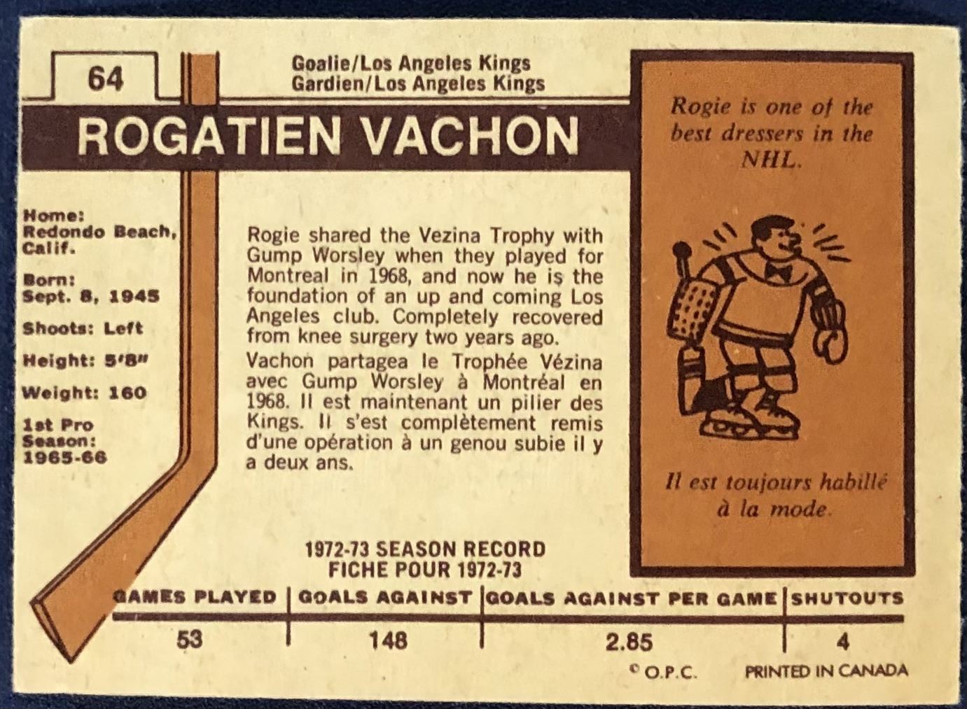 Lot 977 1973-74 O-PEE-CHEE NHL ROGIE VACHON (HOF)