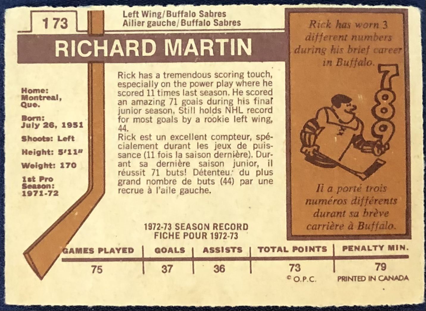 Lot 979 1973-74 O-PEE-CHEE NHL RICK MARTIN (HOF)