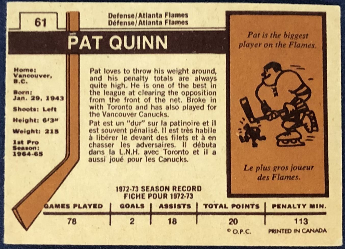 Lot 989 1973-74 O-PEE-CHEE NHL PAT QUINN (HOF)