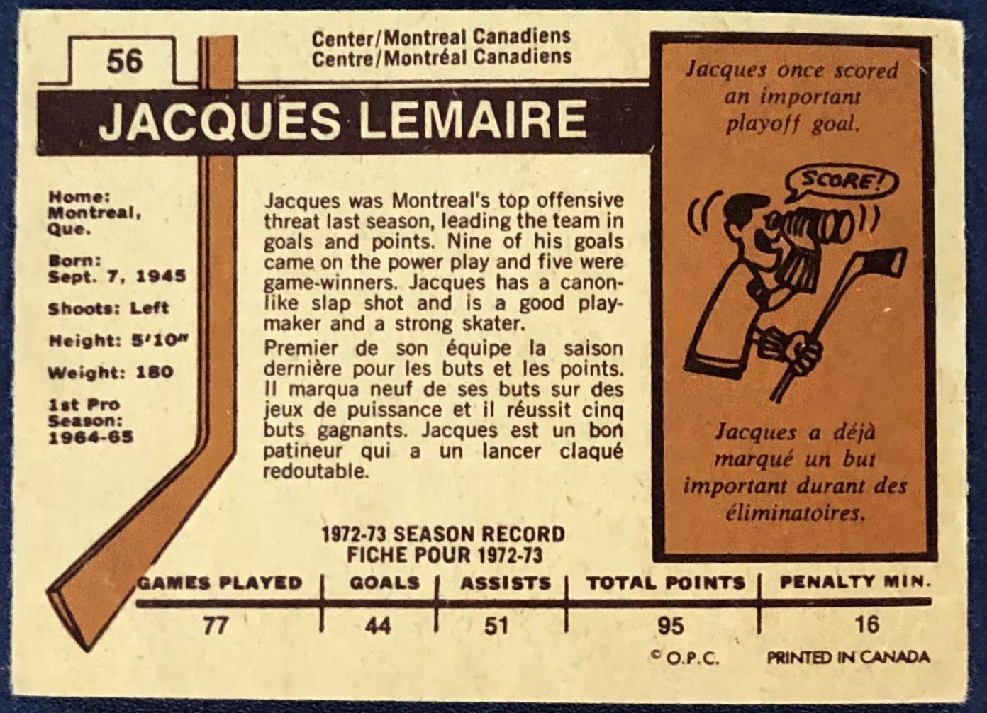 Lot 1001 1973-74 O-PEE-CHEE NHL JACQUES LEMAIRE (HOF)