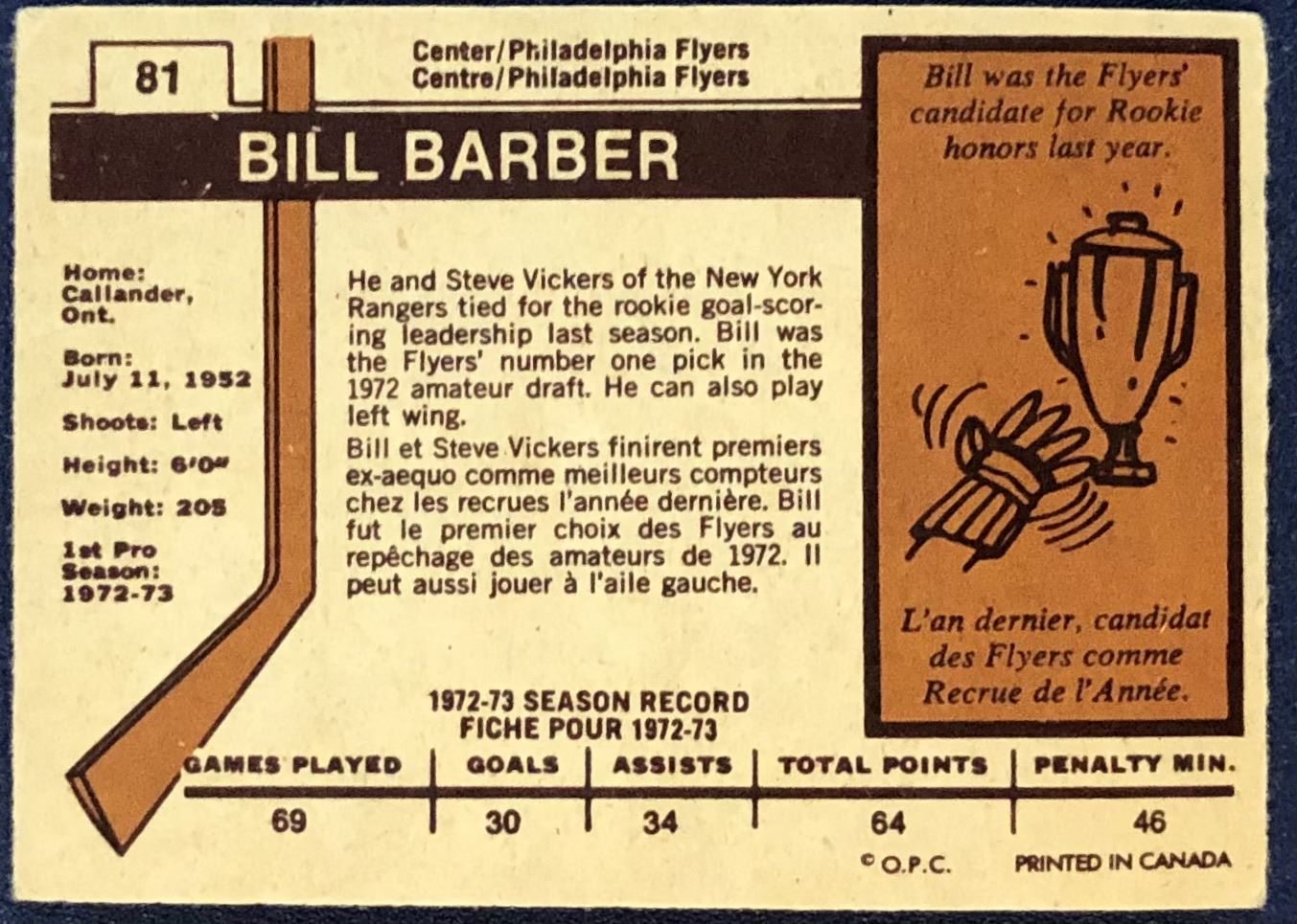 Lot 1022 1973-74 O-PEE-CHEE NHL BILL BARBER (HOF) ROOKIE CARD