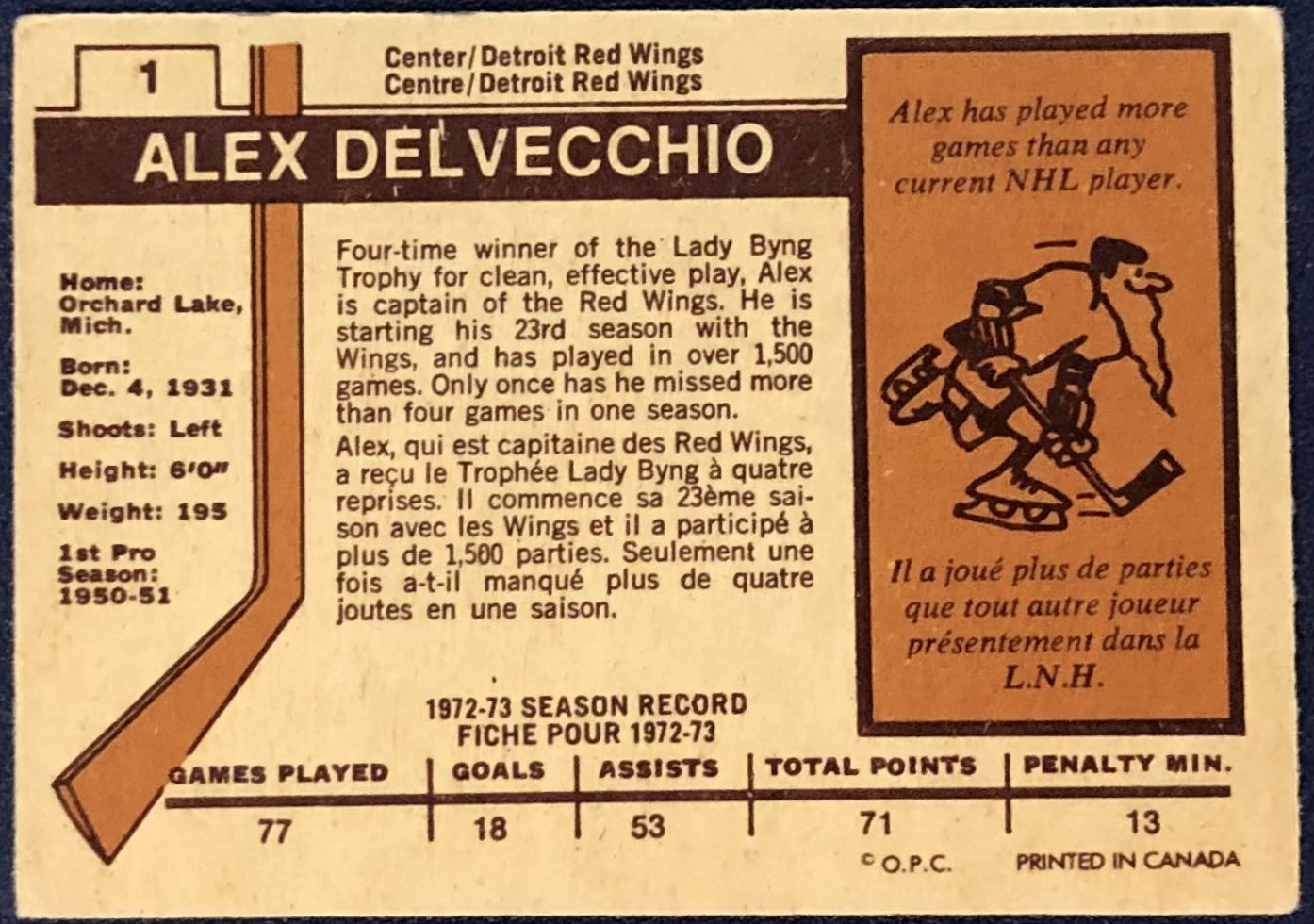 Lot 1025 1973-74 O-PEE-CHEE NHL ALEX DELVECCHIO (HOF)