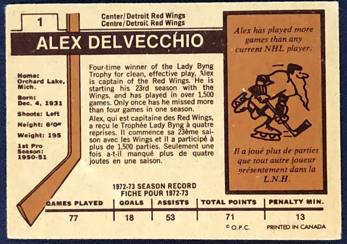 Lot 1036 1973-74 O-PEE-CHEE ALEX DELVECCHIO (HOF)