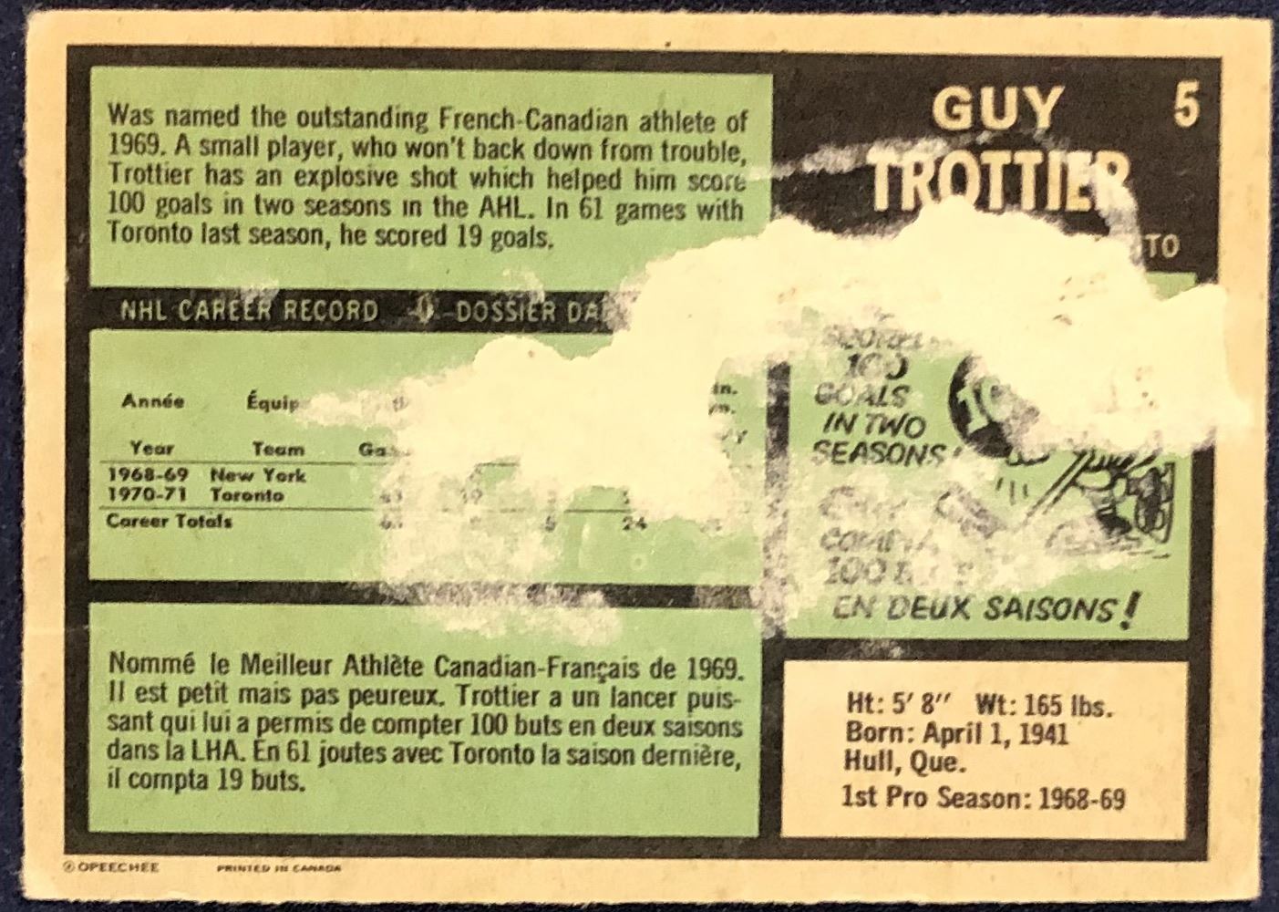 Card #5 (filler quality, paper loss on back) NHL, hockey, vintage, OPC, rookie
