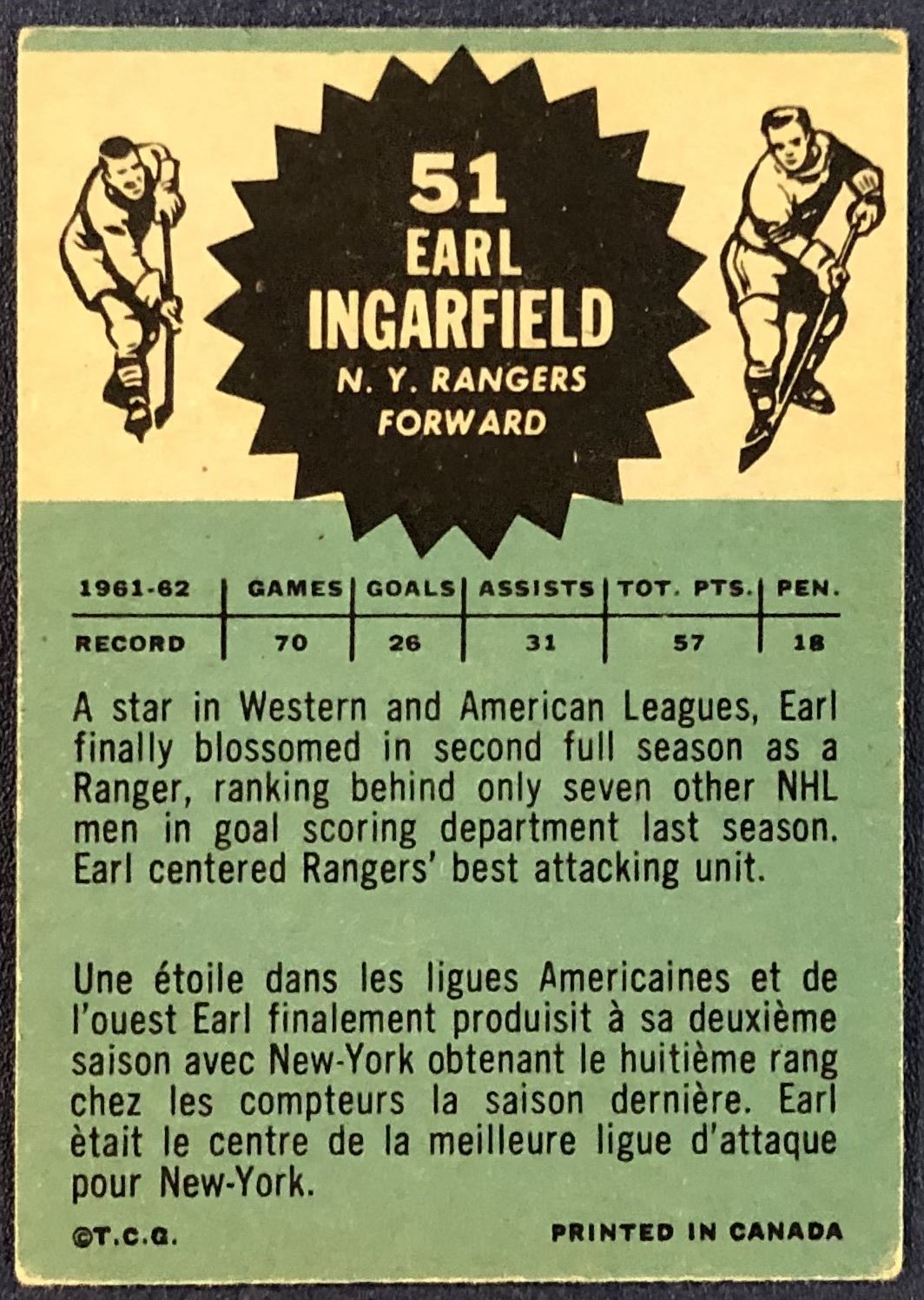 Lot 1050 1962-63 O-PEE-CHEE EARL INGARFIELD ROOKIE CARD