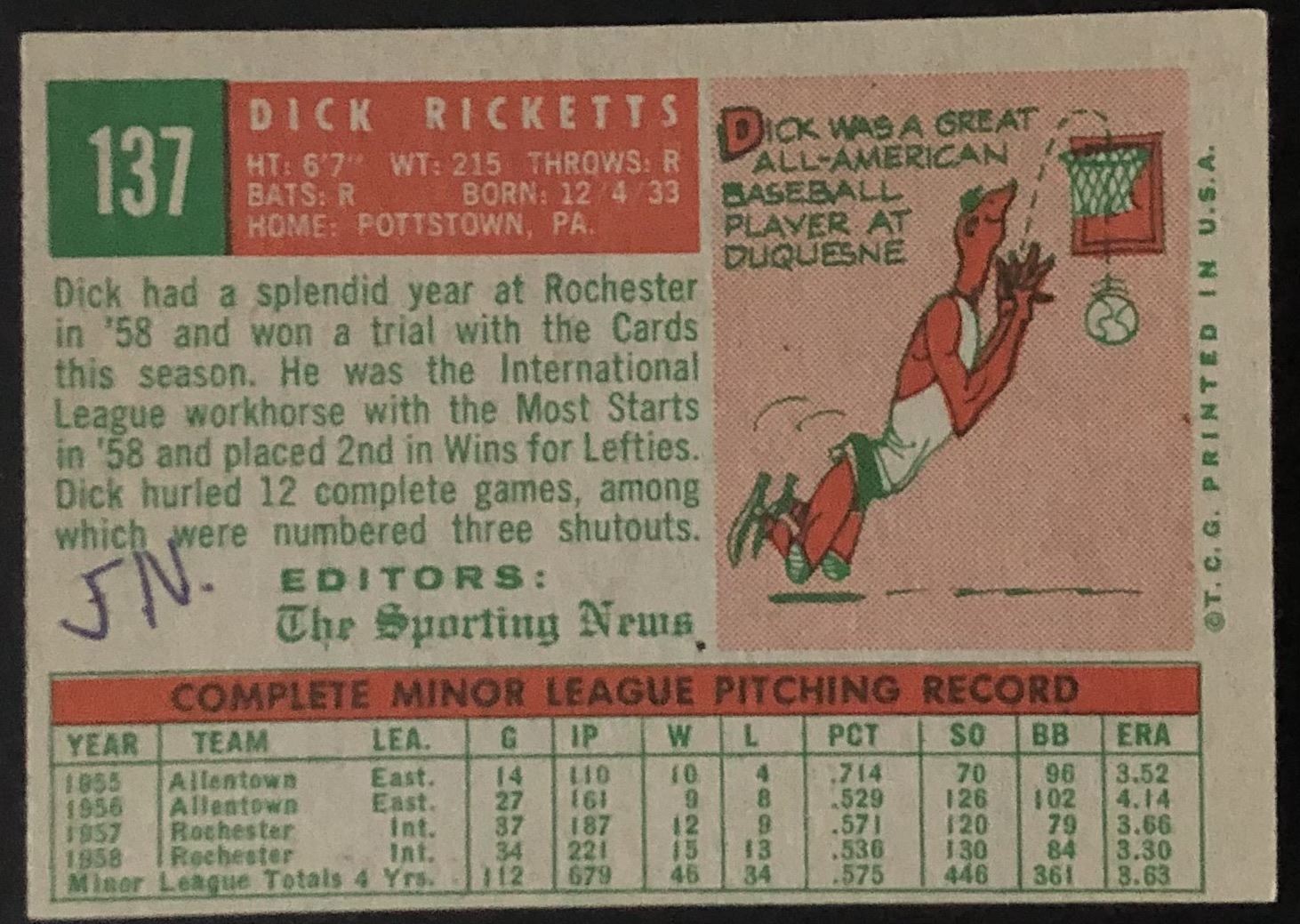 Lot 1110 1959 TOPPS GRAYBACK DICK RICKETTS ROOKIE CARD