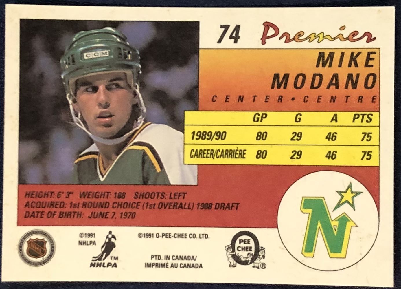 Lot 1130 1990-91 O-PEE-CHEE PREMIER NHL MIKE MODANO (HOF) ROOKIE CARD