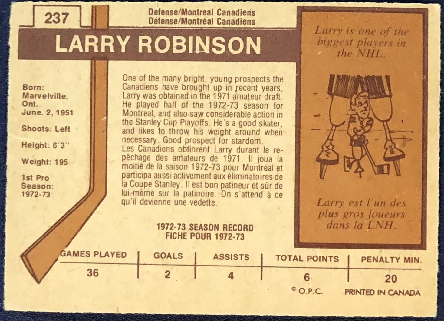 Lot 1145 1973-74 O-PEE-CHEE NHL LARRY ROBINSON (HOF) ROOKIE CARD
