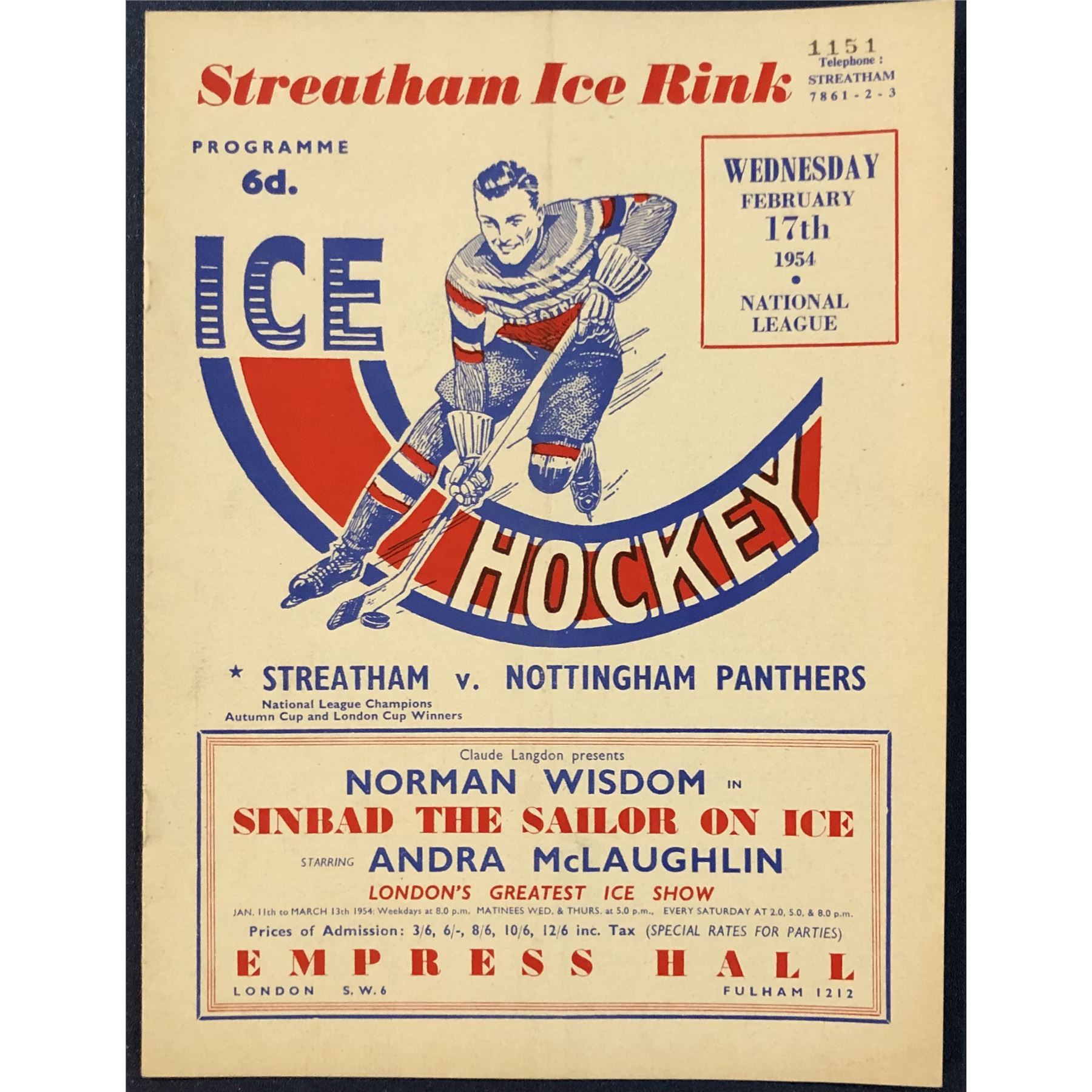 1953-54 BRITISH NATIONAL HOCKEY LEAGUE GAME PROGRAM