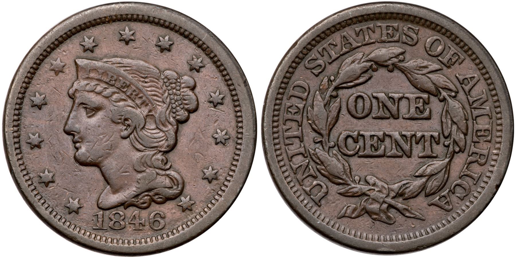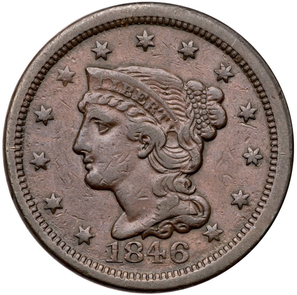 1846 N-10 R-4 F15VF sharpness but there are numerous nicks scattered on the portrait and fields. The most notable include clusters on the cheek and neck, and a rim nick at I in AMERICA. Chocolate brown with light steel on the high points. Smooth surfaces. Ex; Hugh Bodell