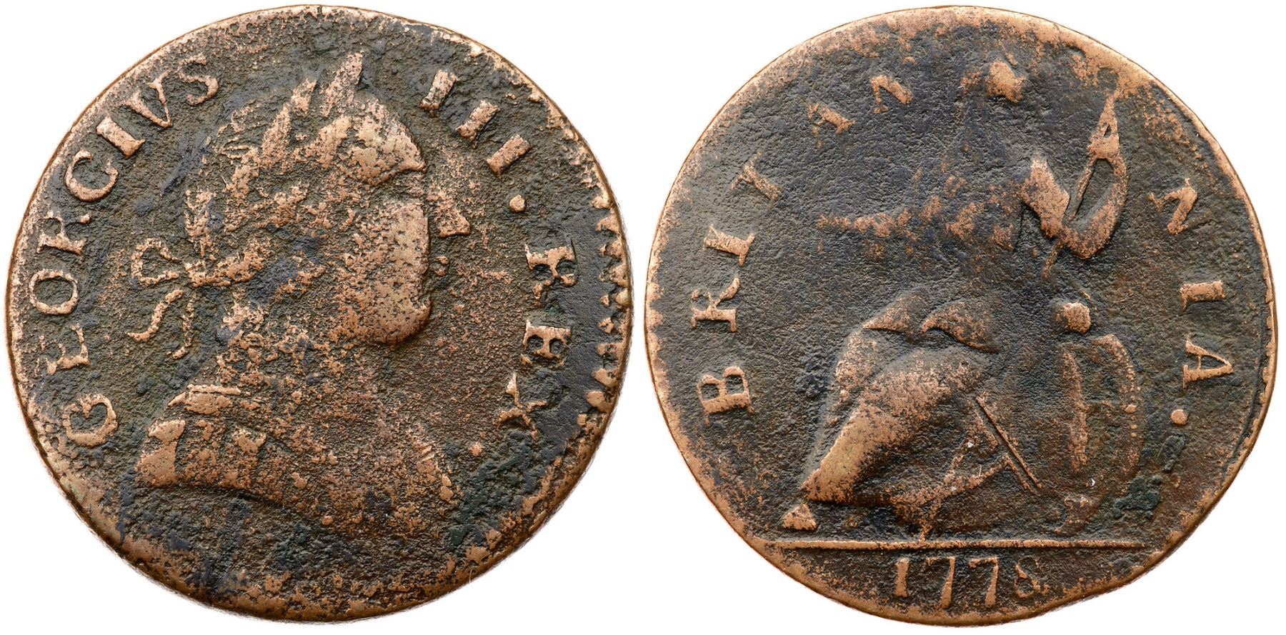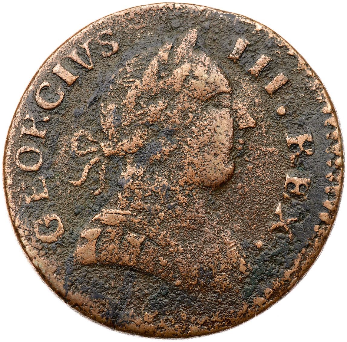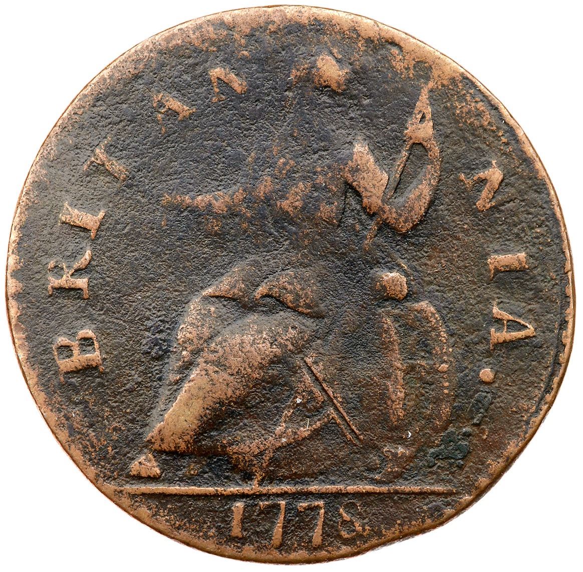 1778 Vlack 13-78B R-5 Machin's Mills Halfpenny F12Sharpness VF30 but covered with fine roughness and the planchet is slightly bent. No marks or verdigris, and the toning is a rather attractive slightly glossy chocolate and olive brown with lighter brown on the devices. The two-tone appearance accents the details and adds to the eye appeal. The date and legends are complete and clear. A decent example of this tough variety. Weight 103.2 grains.