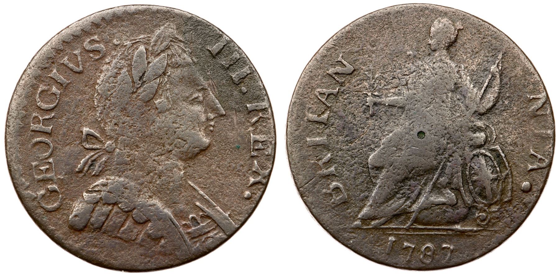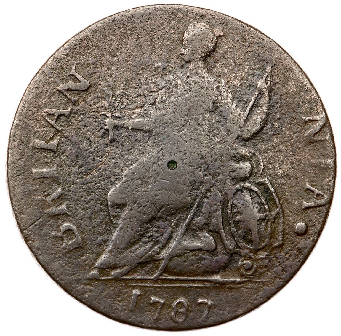 1787 Vlack 17-87A R-5 Machin's Mills Halfpenny F12harpness near VF25 but covered with fine granularity. No verdigris and the only mark is a tiny punch in the center of the reverse. Slightly glossy chocolate brown and steel. The date and legends are complete and clear. Listed on page 67 in the 2023 "Redbook." Weight 117.1 grains.Ex Fred Hazen, 2003 C-4 Sale, McCawley & Grellman Auctions 11/8/2003:489 (lot ticket included)