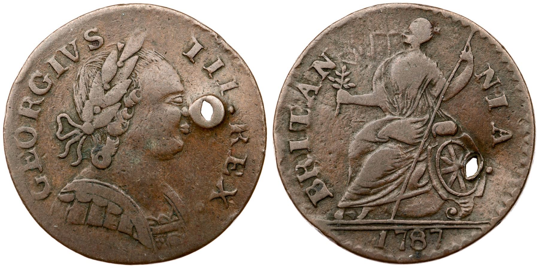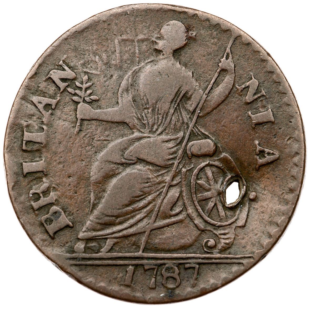 1787 Vlack 21-II-87D R-4 Machin's Mills Halfpenny VF25 but HoledChoice glossy light to medium chocolate brown. A premium Machin's halfpenny except for a hole that was punched through the shield from reverse to obverse. Perhaps nailed to a door jamb over the front door of a residence for good fortune (popular at the time). The date and legends are strong. Listed on page 67 in the 2023 "Redbook." Weight 120.0 grains.Ex A. D. Hoch 1/28/1962