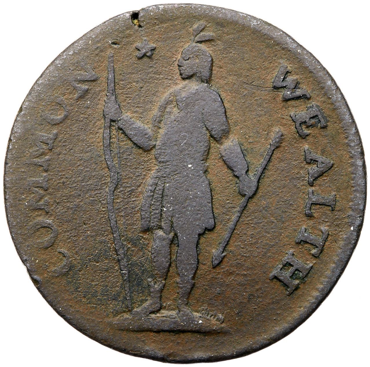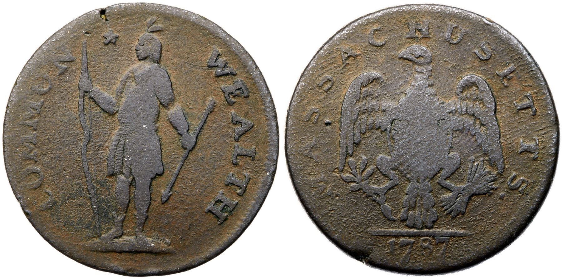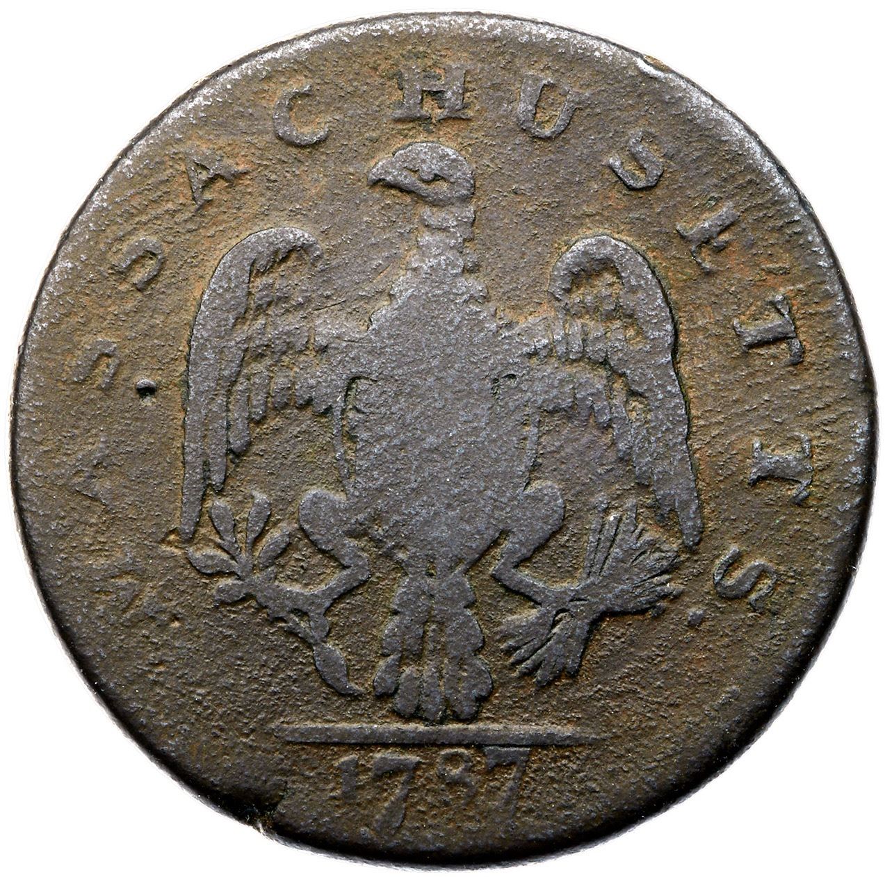 1787 Ryder 2b-E R-5 Massachusetts Cent G5Slightly sharper but covered with fine roughness. No verdigris and the only mark is a small planchet fissure at K-11 on the obverse and the opposing K-7 on the reverse. Chocolate and dark steel brown. The date is clear as are most of the letters in the legend. Weight 142.3 grains.Ex Empire Coin Company ($4.00)-unknown-The Provenance Collection