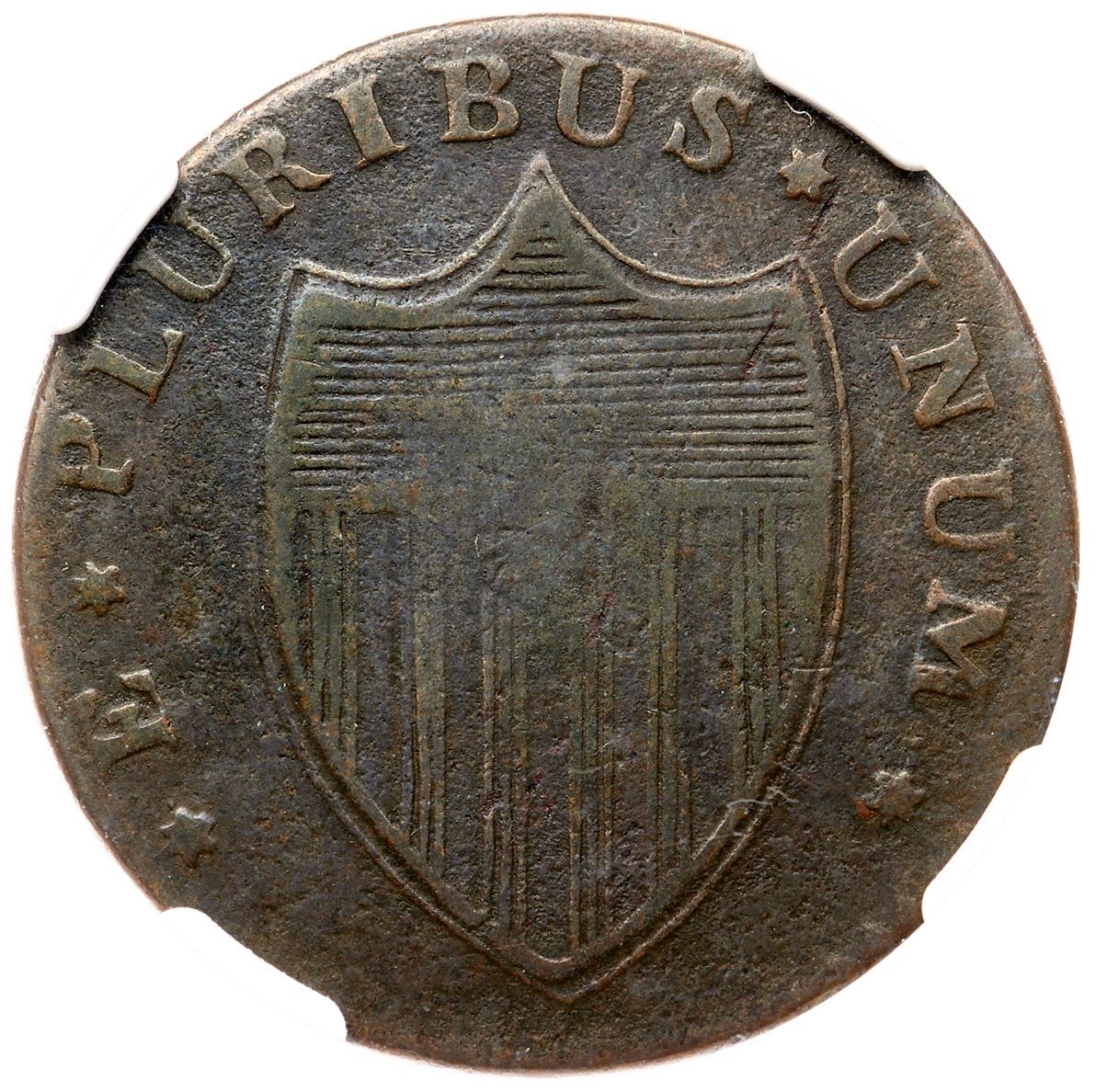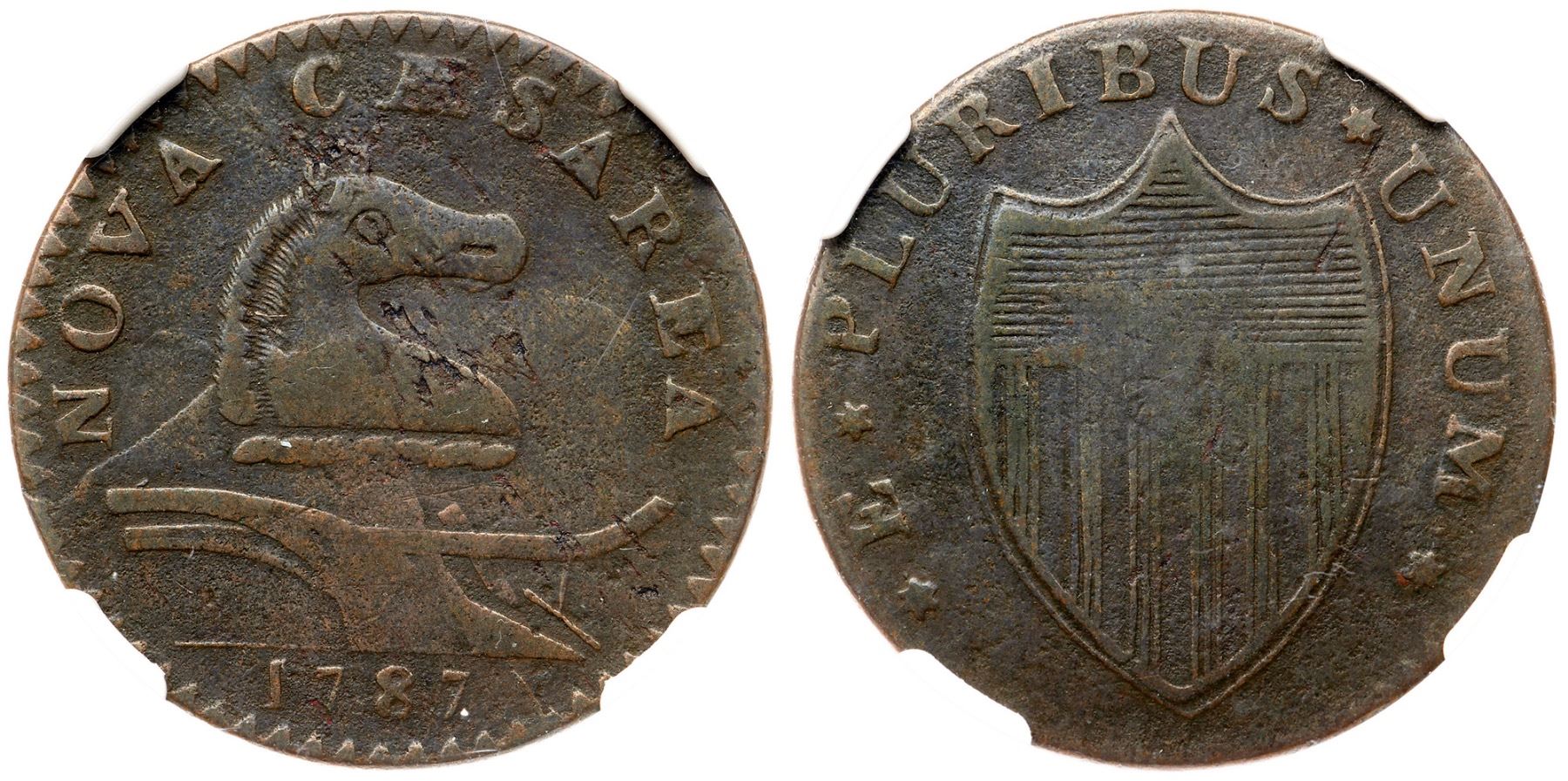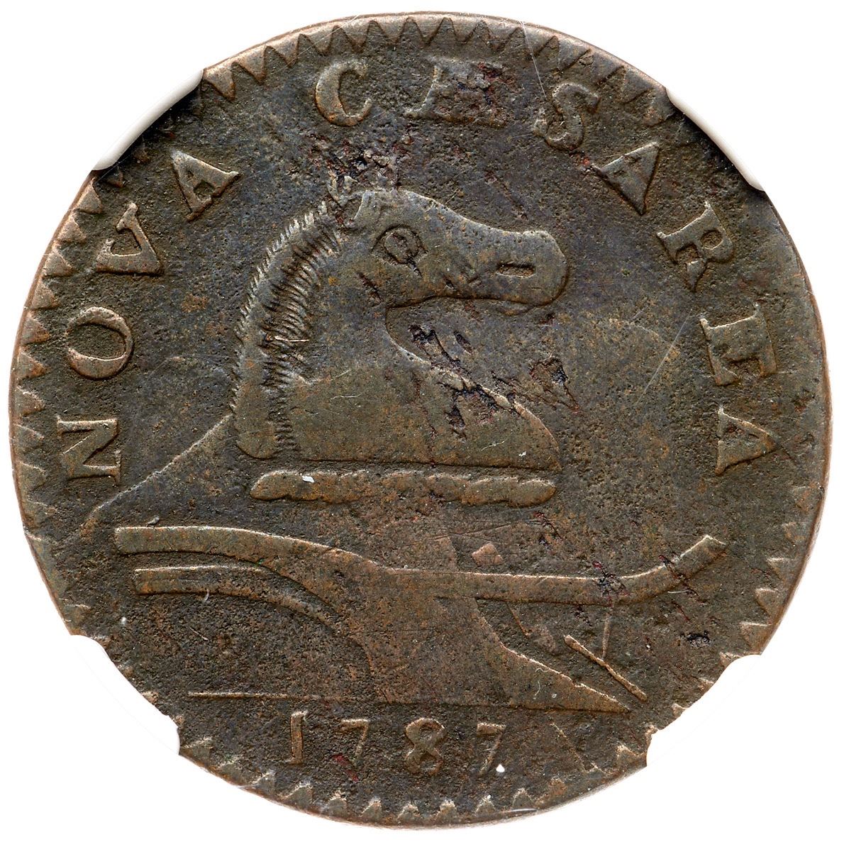 1787 Maris 31-L R-3 No Sprig Above Plow New Jersey NGC VF20Rather glossy olive brown and steel. Mostly smooth but there is a streak of tiny planchet flakes on the obverse, as struck. Well struck with a strong date and legends. LDS with die cracks on the obverse, one of which meanders across the obverse effectively bisecting that die. A neat die state. Our grade is consistent with the NGC grade. Listed on page 70 in the 2023 "Redbook."3898271-010Ex Wayne Shelby-Shawn Yancey