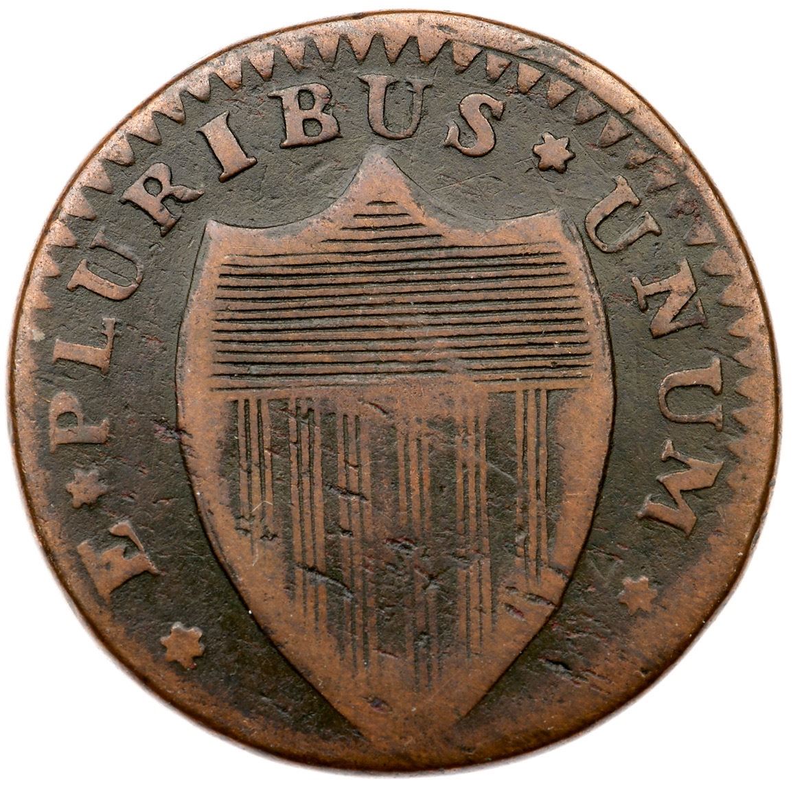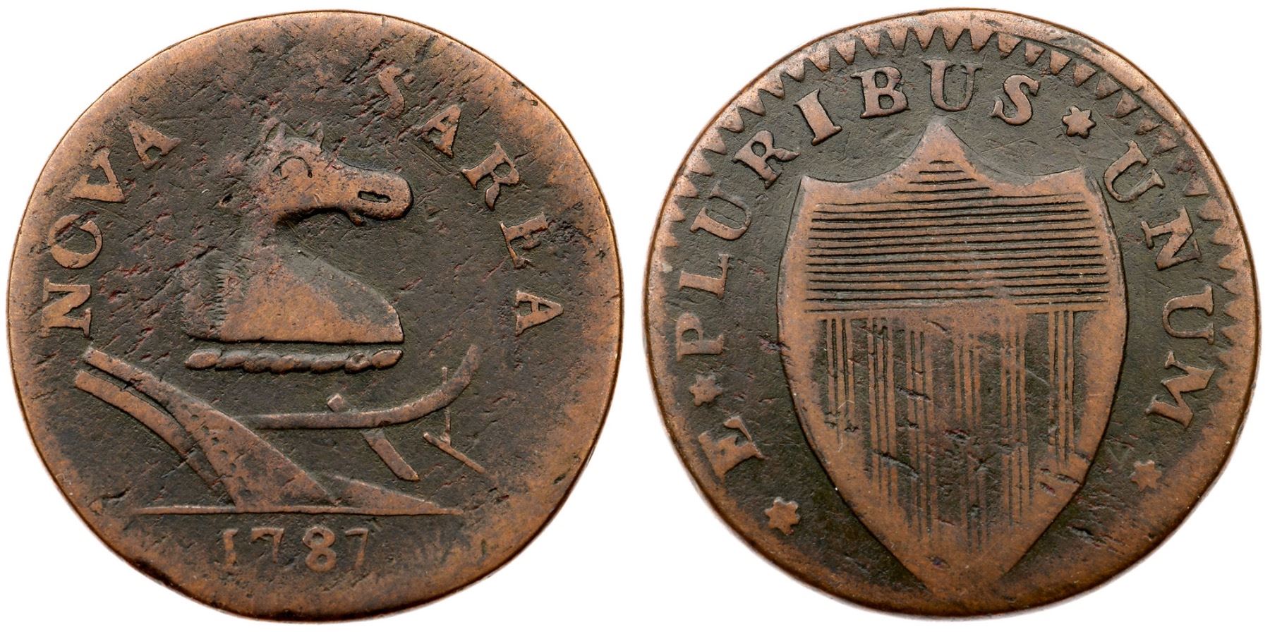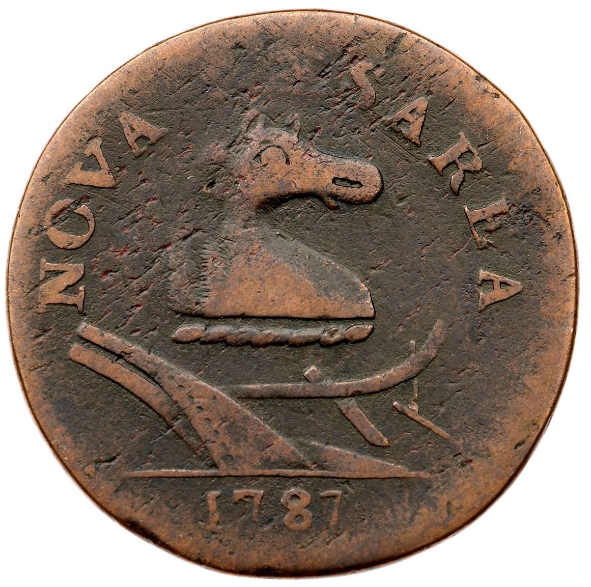 1787 Maris 44-d R-4 Sleigh Runner Variety New Jersey F12Slightly glossy chocolate brown with lighter brown toning on the devices. Mostly smooth but there are small planchet striation chips on both sides and some fine roughness over the second E in CAESAREA. No verdigris or contact marks. The date and legends are complete and clear except for CAE, which is faint thanks to being a bit off center to the top. The "Sleigh Runner" shape of the plow beam is clear. A variety without the sprig above the plow. Listed on page 70 in the 2023 "Redbook." Weight 141.8 grains.Ex Tom Rinaldo, 2003 C-4 Sale, McCawley & Grellman Auctions 11/8/2003:416 (lot ticket included)