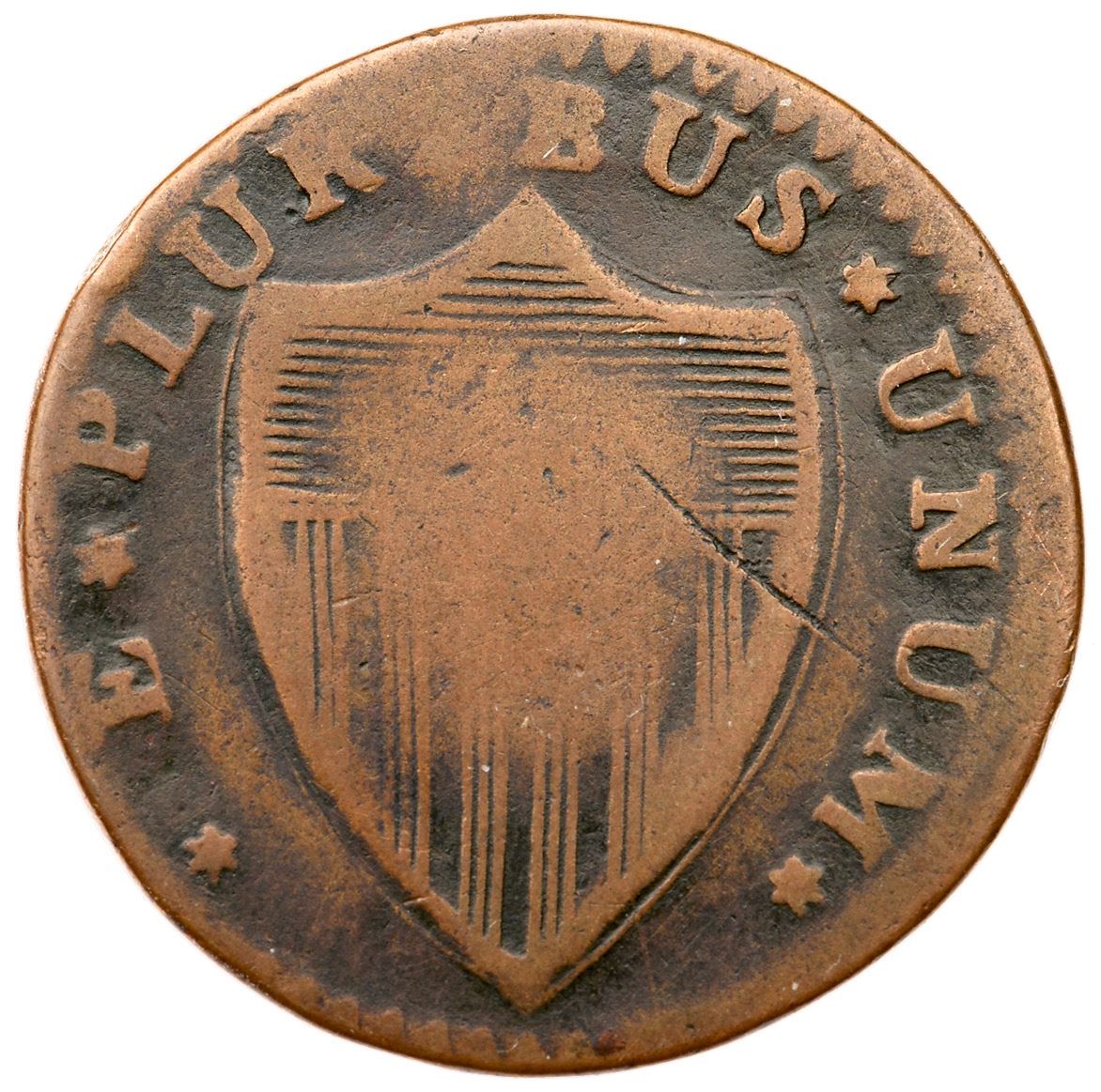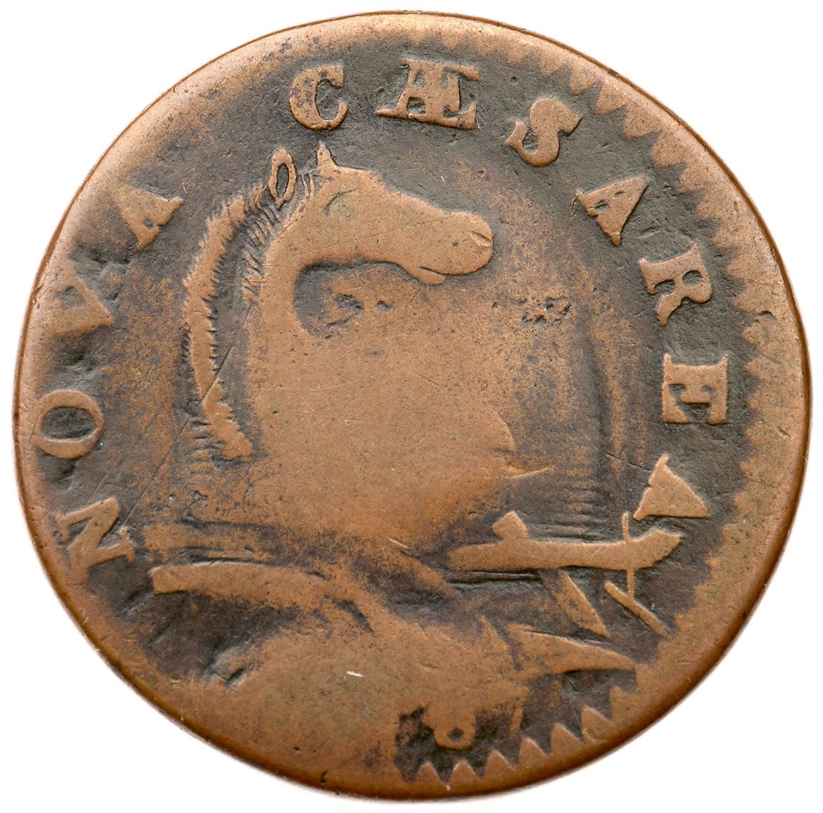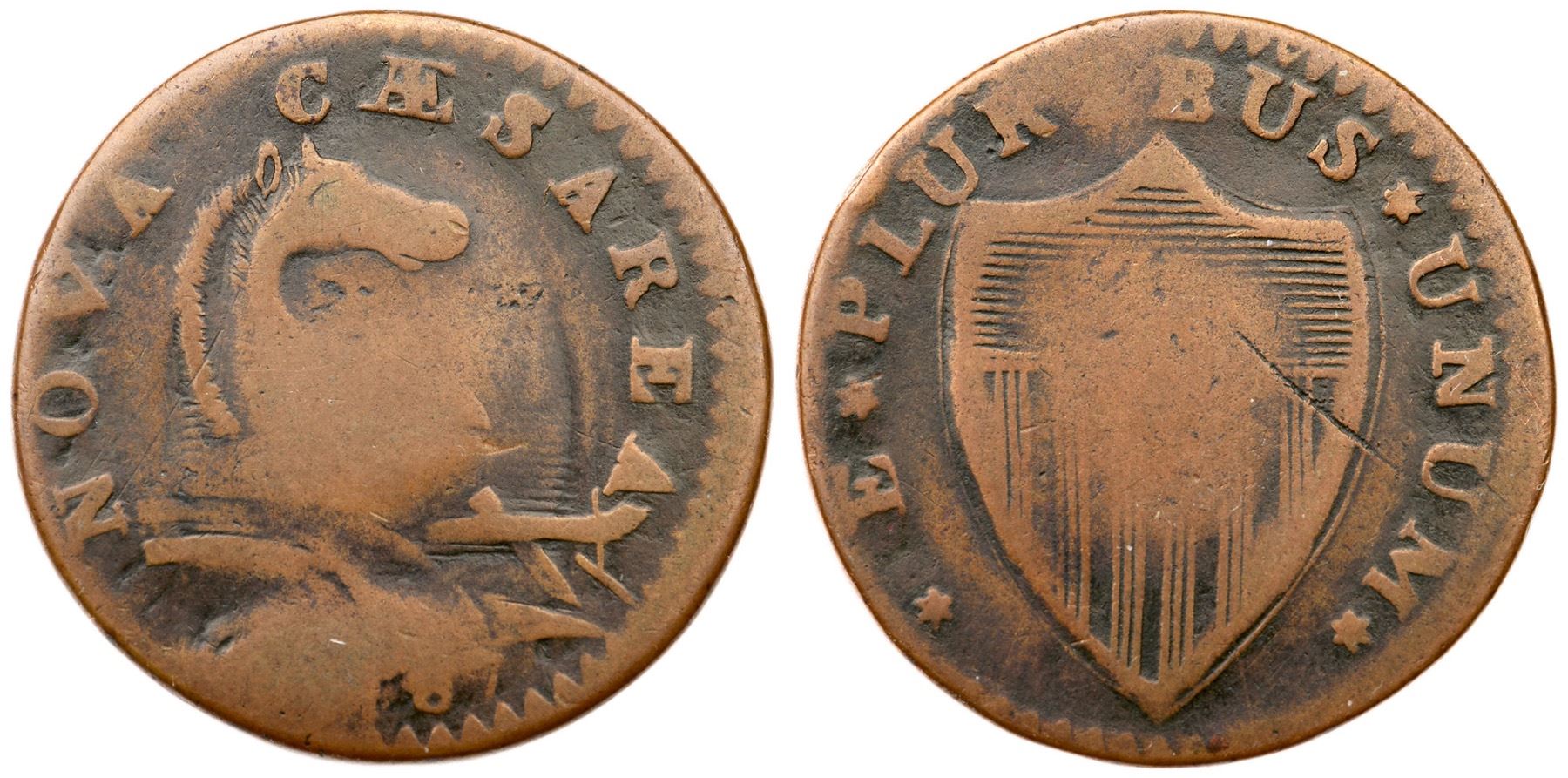 1787 Maris 46-e R-1 No Sprig Above Plow New Jersey VG10Glossy olive brown with light brown toning on the devices. The two-tone appearance accents the devices and this piece has nice eye appeal for the grade. The only mark is an old scratch on the right side of the shield. Later die state with significant swelling that obliterates the 17 in the date and the opposing I in PLURIBUS. Listed on page 70 in the 2023 "Redbook." Weight 143.9 grains.Ex Imperial Coins at the 1982 ANA in Boston 8/1982-John D. Wright, 2006 C-4 Sale, McCawley & Grellman Auctions 12/2/2006:560 (includes the Wright collection envelope and lot ticket)