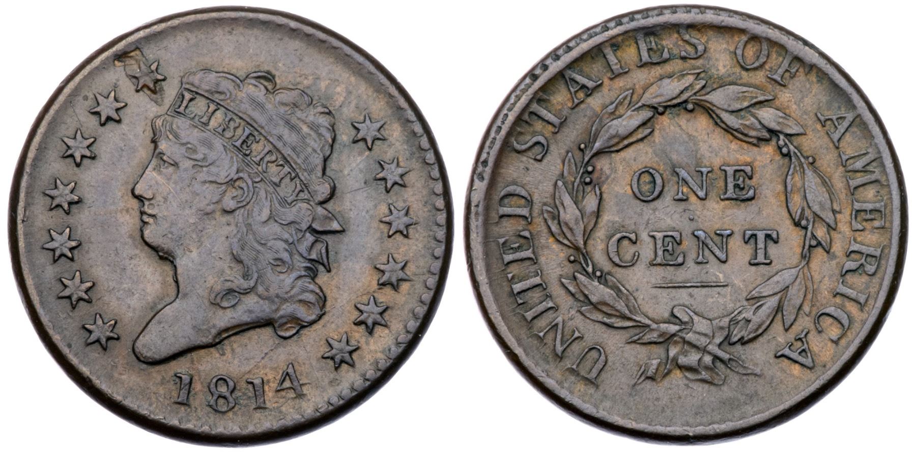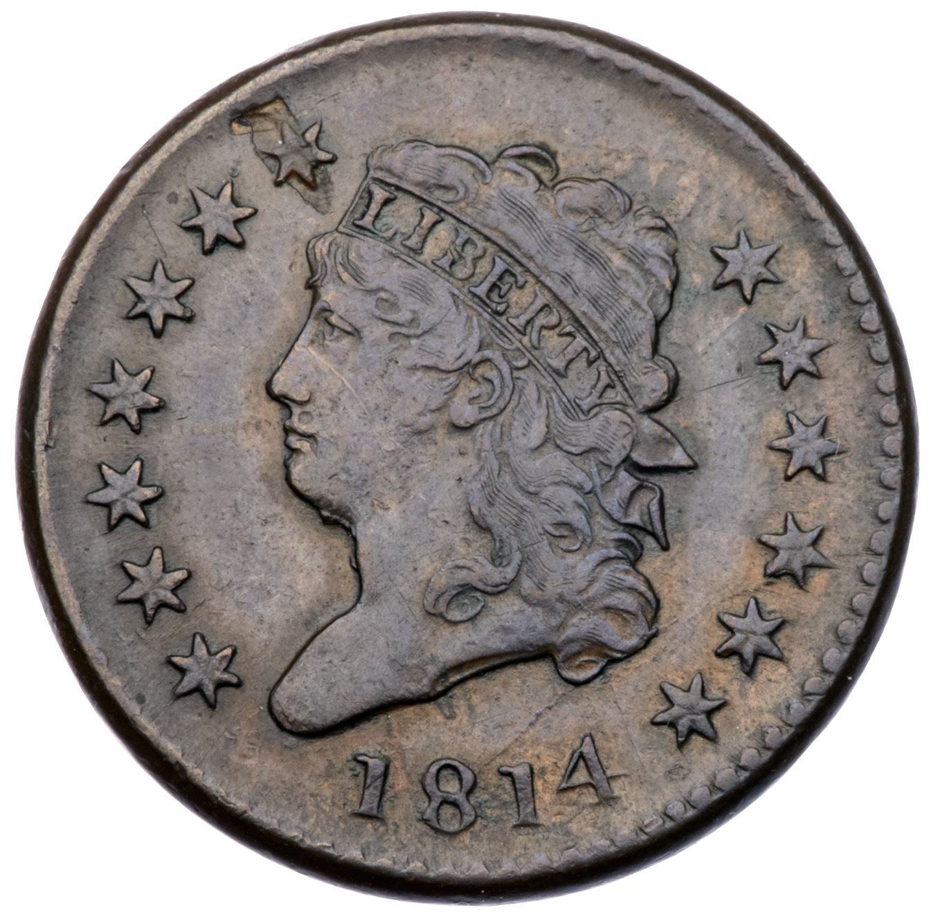 1814 S-295 R-1 Plain 4 F15VF30+ but there is tooling in the hair, a lamination on star 7, a line of ticks before the mouth, and pin prick mark on the upper lip. Mottled tan brown and steel browns on glossy, smooth surfaces. LDS, with the die crack from the rim to the bust tip very faint but visible, and the stronger crack from the rim through 8, the lowest curl, and star 11 to the rim clear. Crumbling at the throat. Smooth surfaces.Ex; Fred Clymer (original card included) - Fred Borcherdt