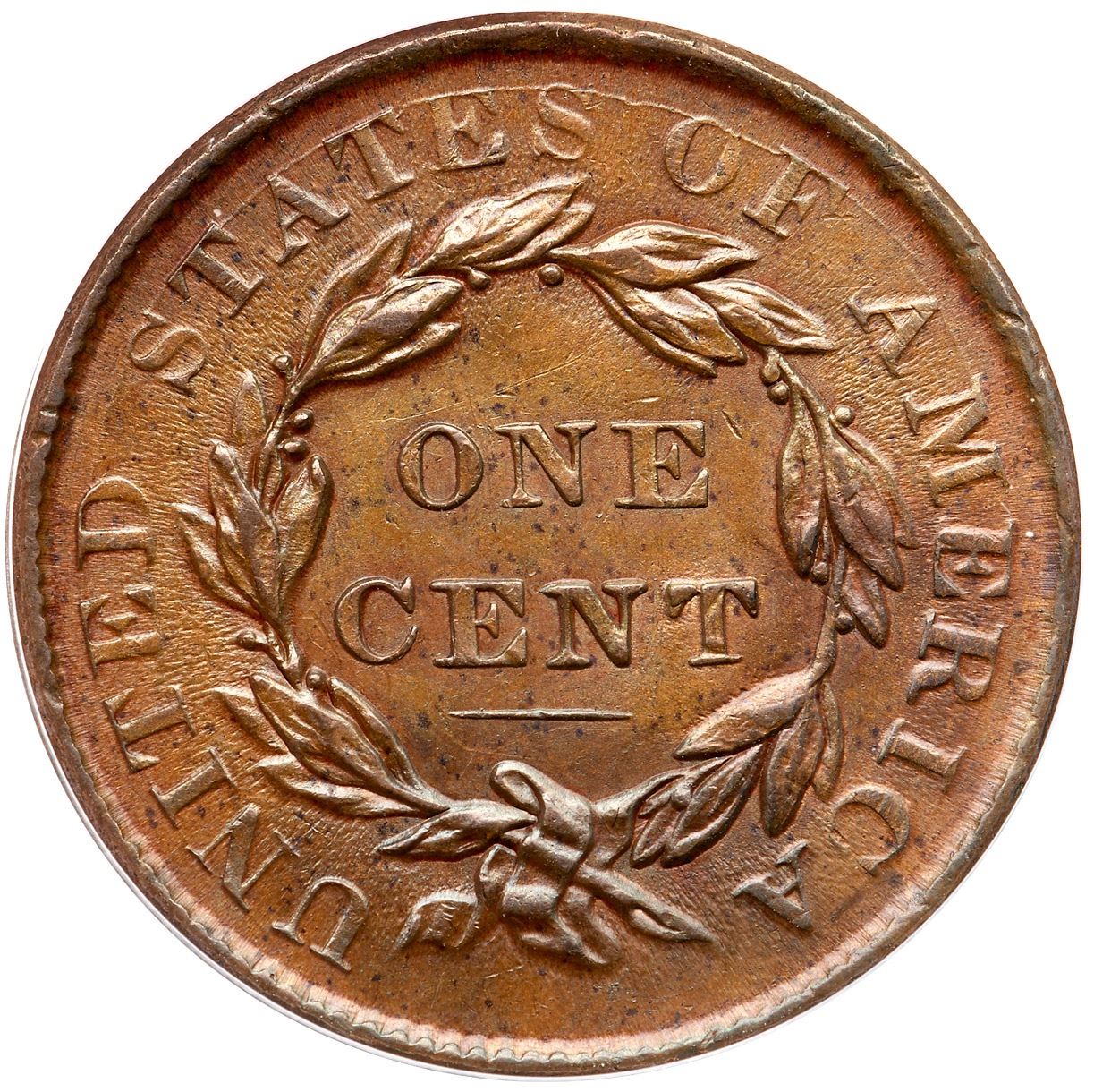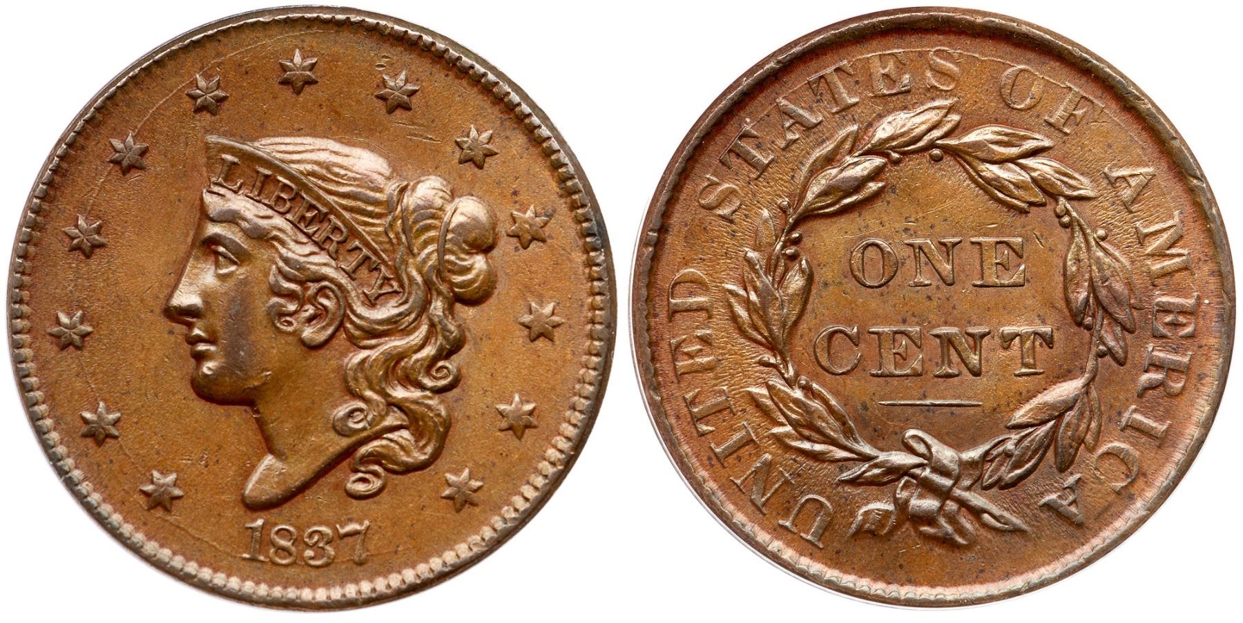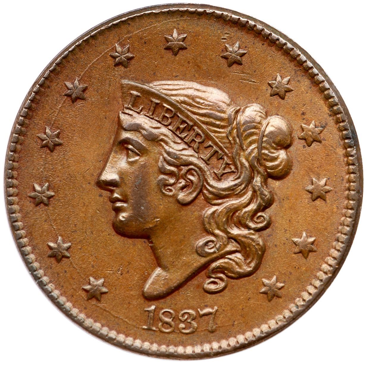 1837 N-14 R-2 ANACS AU58Golden olive brown with deeper tones along the lower reverse and peeps of very faded mint red underneath in some protected areas. There are a few minor nicks on the jawline, throat, and before the laurel tip. Lustrous surfaces. Our grade is AU55. 7341293