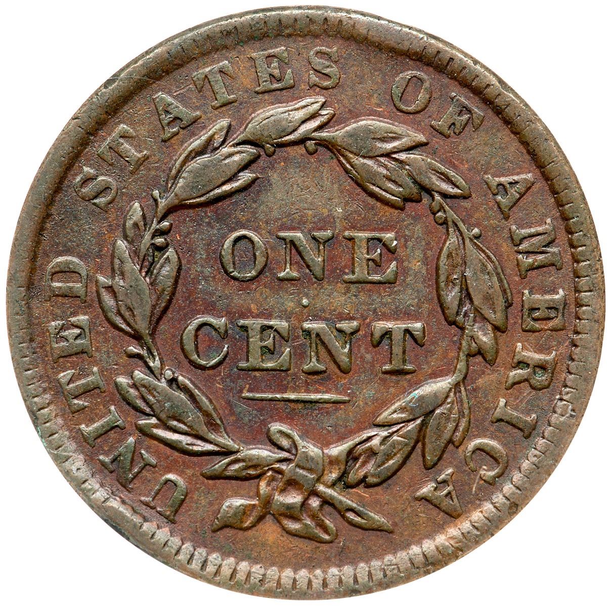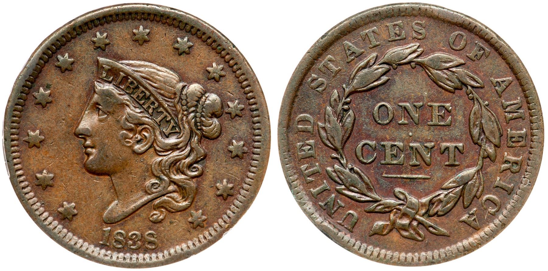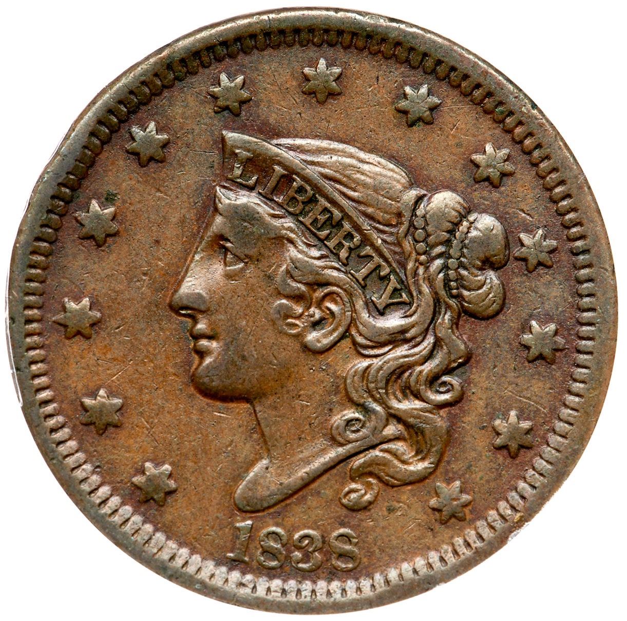 1838 N-11 R-2 ANACS VF35Light to medium olive browns with reddish chocolate tones in some reverse protected areas. The notable marks include a few minor rim bruises at stars 4, UN, and S-O, and a faint diagonal hairline scratch on the cheek. Smooth and glossy. Our grade is VF30.7341283