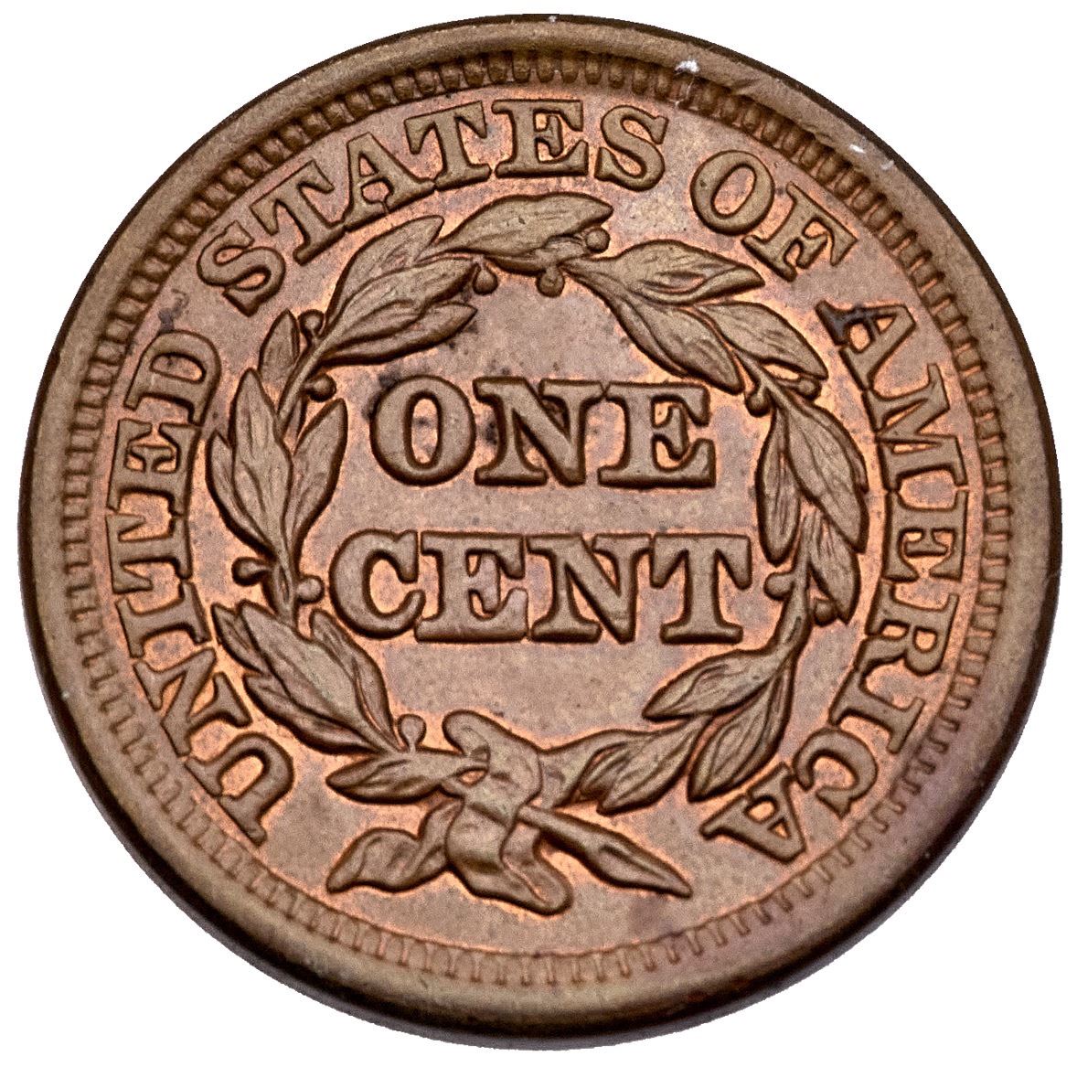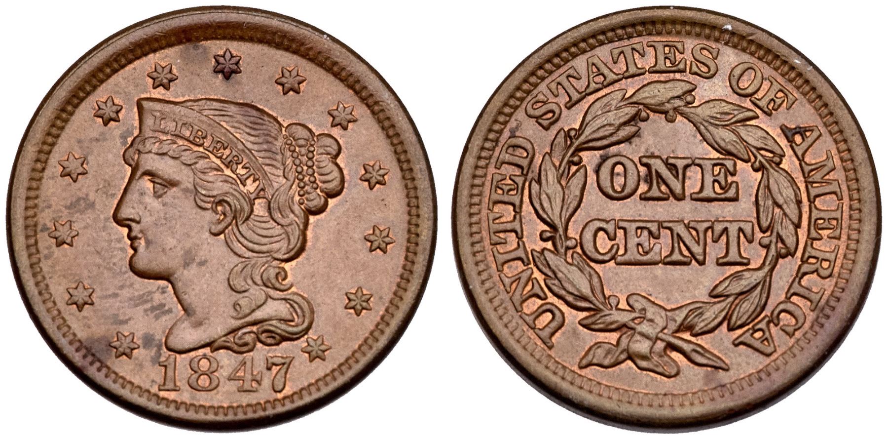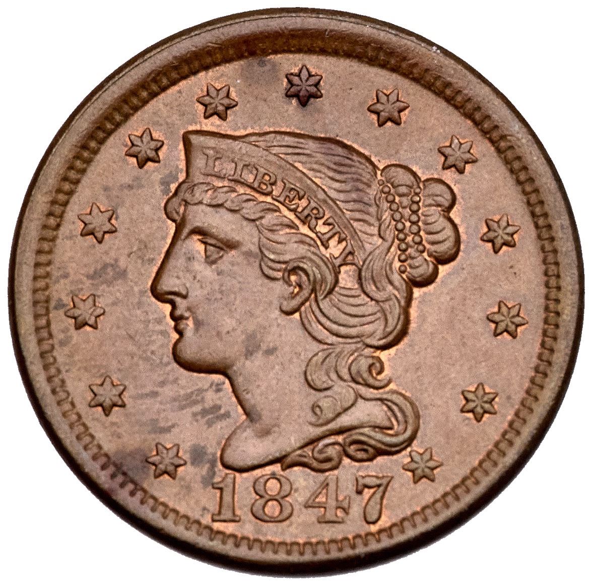 1847 N-19 R-1 MS60Glossy light steel brown with 5-10% of the original mint red remaining. There are traces of an old fingerprint on the left side of the obverse and a thin, light nick in the field under star 4. LDS, state b late. Tied for CC#5 for the variety, but CC#1 of the LDS. Noyes photo #30326. Ex; 1988 FUN Bourse - J.R. Grellman 7/1995 - R.S. Brown Jr. Part III Superior Lot 405