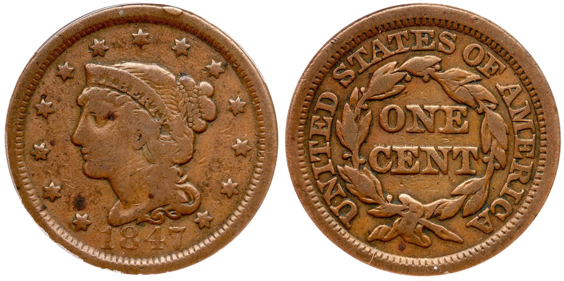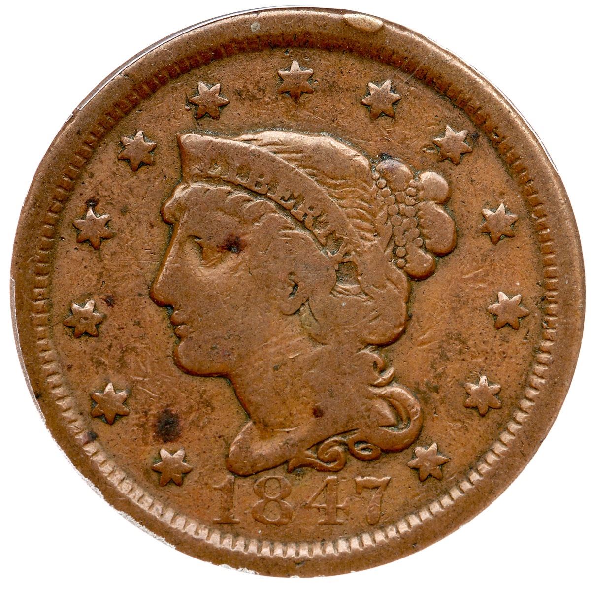 1847 N-36 R-5 ANACS VG8Light to medium browns with a few scattered dark reddish chocolate brown spots on both sides. The notable marks include a rim bruise above star 8 and a nick behind the eye, trivial marks otherwise. Our grade is consistent with ANACS, VG8.7341292