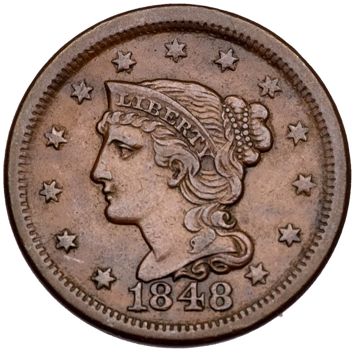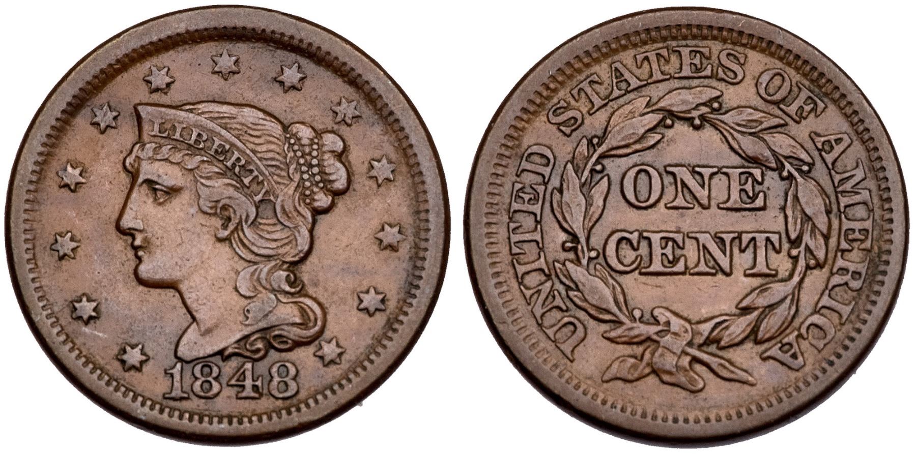 1848 N-2 R-2 VF35+Attractive light to medium browns with deeper steel in some areas. There are trivial marks and abrasions on the devices and fields, nothing major. Smooth surfaces. MDS, die state b. Ex; CVM 12/2006