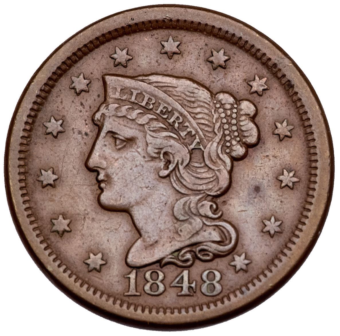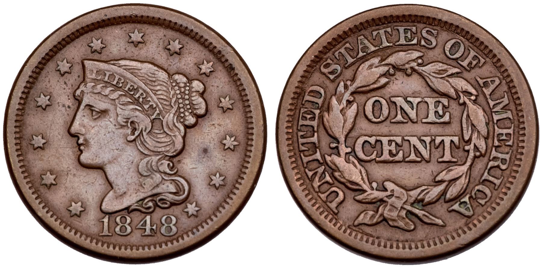 1848 N-21 R-4- VF20Semi-glossy brown and olive. There are wispy hairline scratches on the portrait and fields, and a couple low spots inside the wreath, as struck. Smooth surfaces. M-LDS, state d. Ex; CVM 12/2006