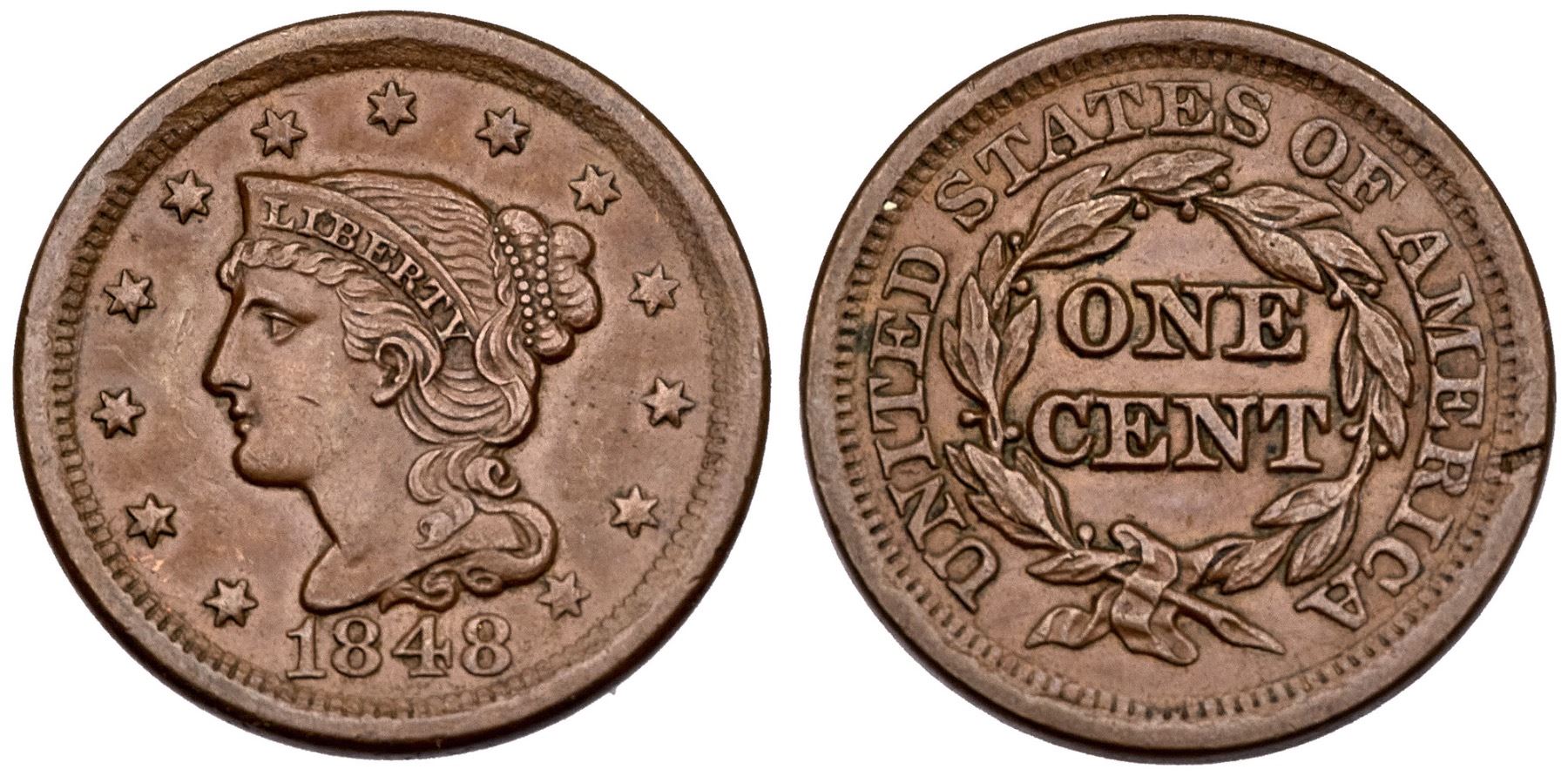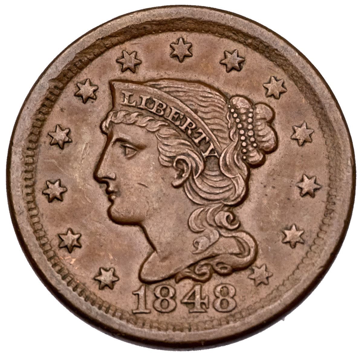 1848 N-24 R-5- VF35EF40 sharpness or slightly better but there are small nicks on the cheek and fields before the face, as well as a planchet chip on the rim over R in AMERICA, as struck. PLeasing glossy medium brown. E-MDS. Ex; J. Kierstead Superior 10/00:1446 - CVM 12/2006