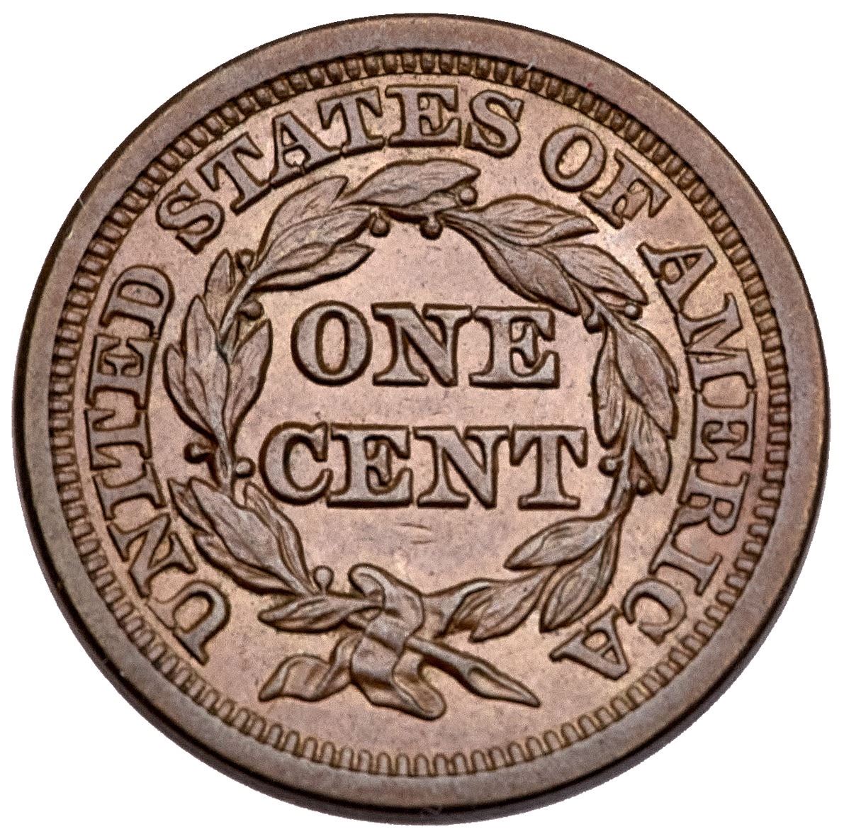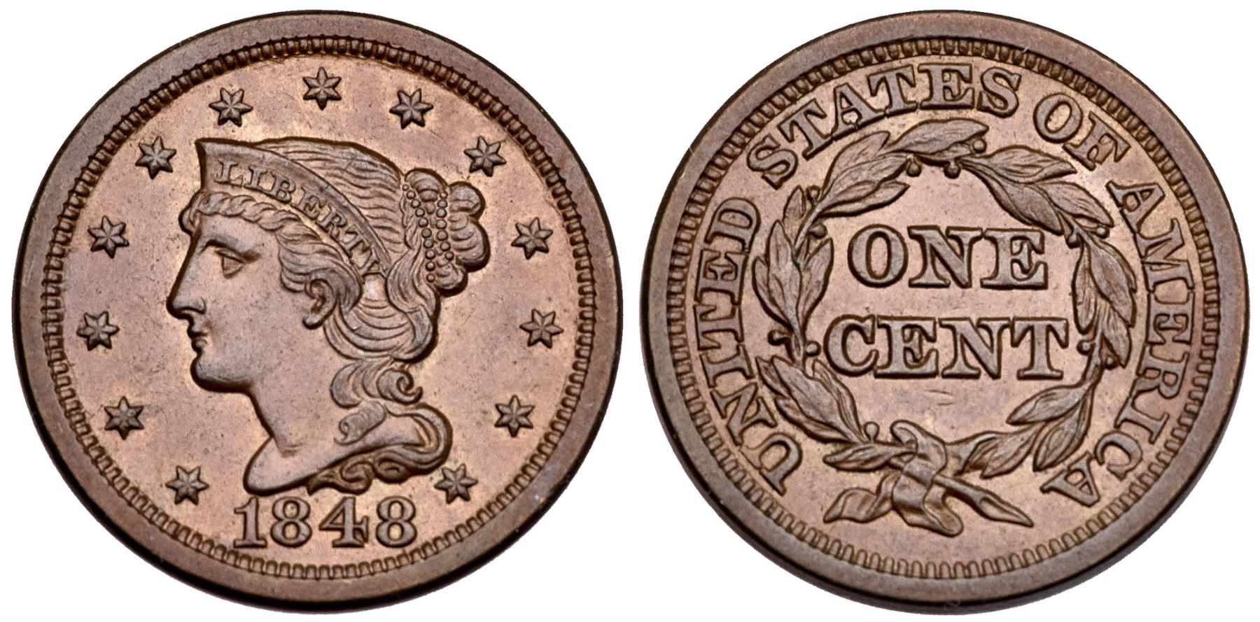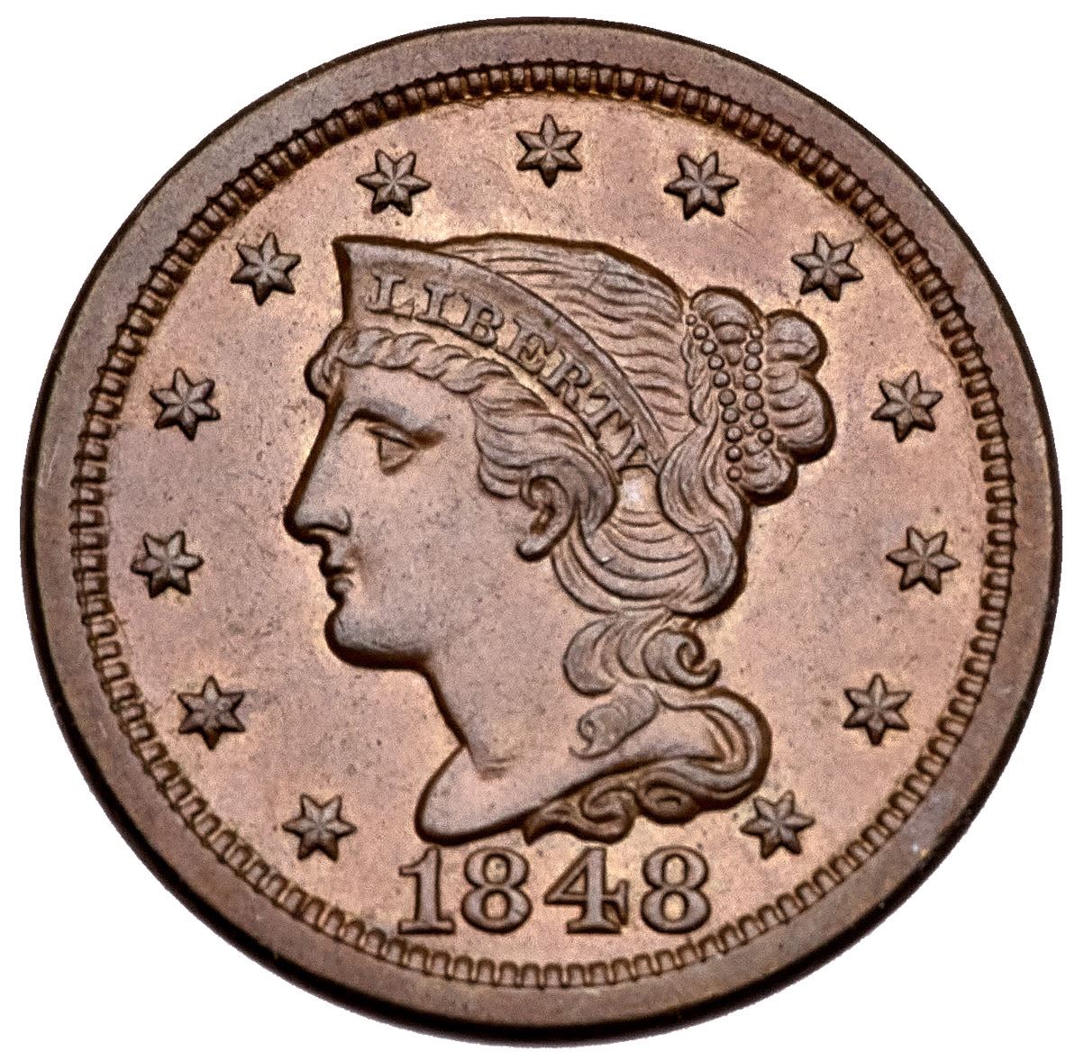 1848 N-27 R-2 AU55Attractive light brown and tan with deeper olive on the high points. The only notable marks are minor nicks below EN in CENT, anda tick behind the mid hair. Frosyt, lustrous surfaces. E-MDS, state b. Ex; CVM 12/2006