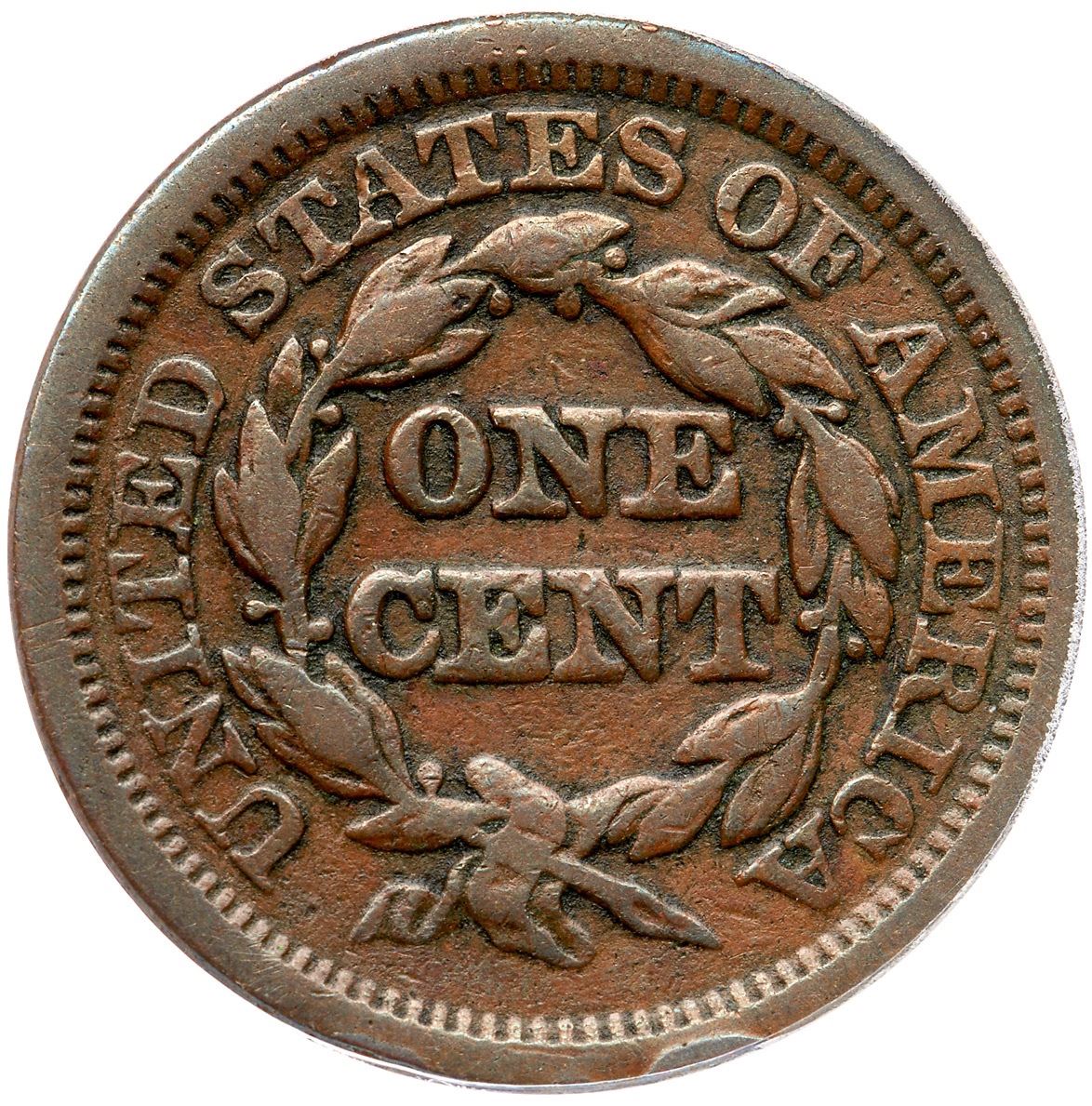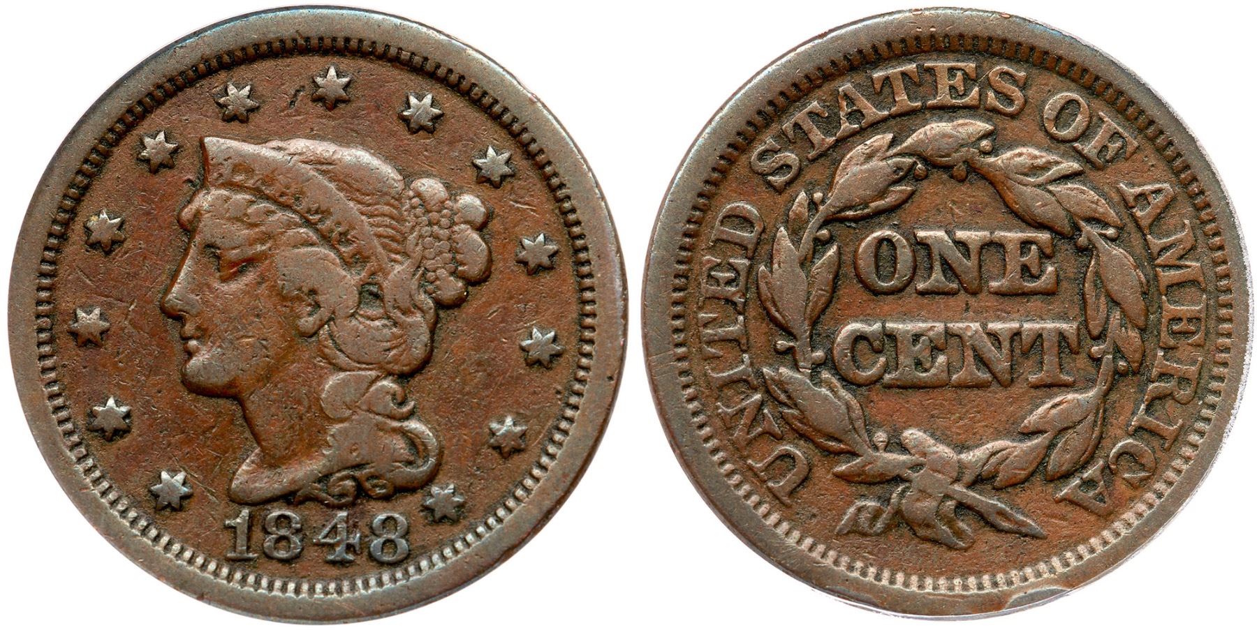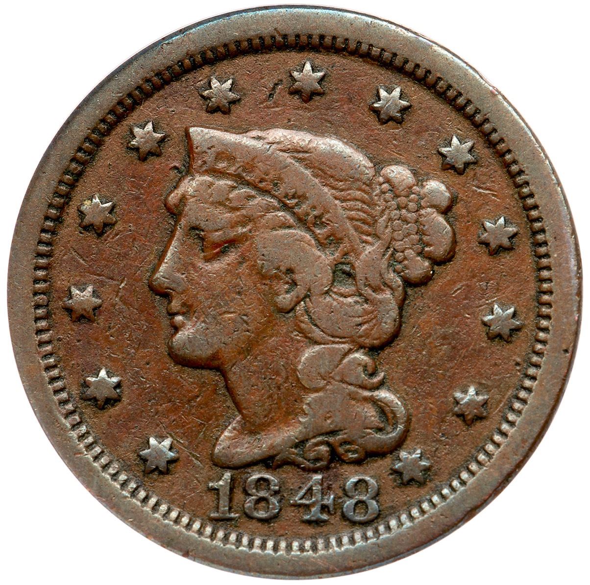 1848 N-32 R-5- ANACS F12Light chocolate brown. A bit dirty with old crud in the protected areas, and scattered nicks on the fields and devices. The most notable include a nick the bottom chin and another left of star 7. EDS die state a with the usual crack through RI to the wreath.7341299