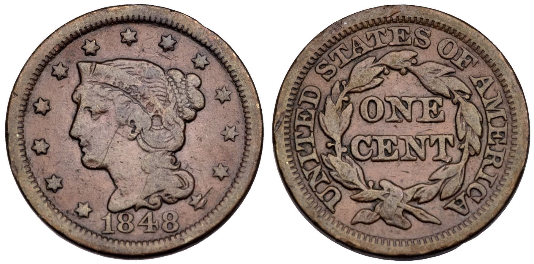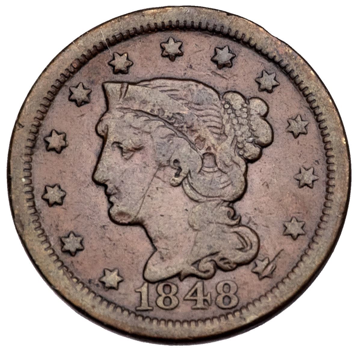 1848 N-34 R-5- VG7VG10 sharpness but there are several nicks and scratches on both sides. Most notable are a nicks on the chin, on the laurel below star 6, on star 13, and over E in UNITED. Glossy medium brown with olive on the devices. Smooth surfaces, MDS. Ex; R.S. Brown - CVM 12/2006