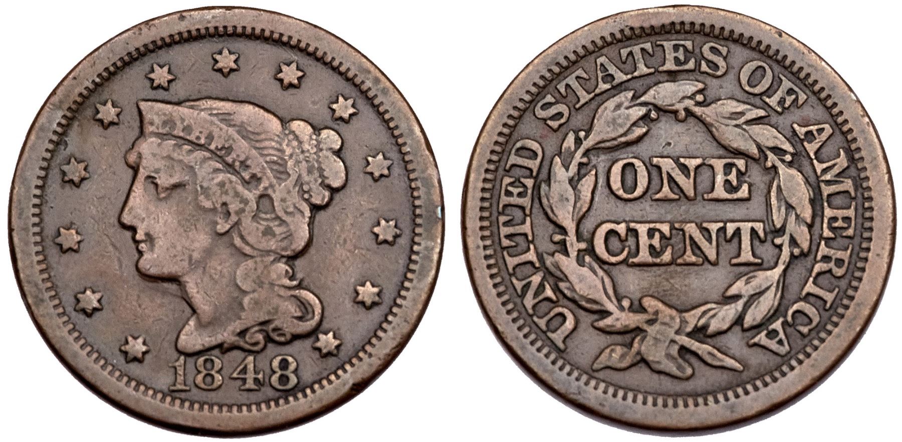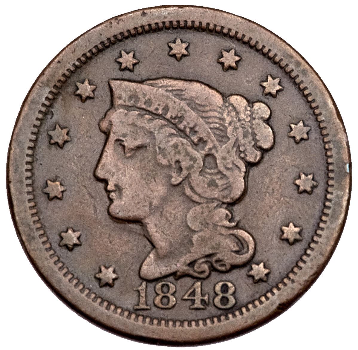 1848 N-36 R-4+ VG10Chocolate and dark browns with traces of grainy crud in some protected areas. There are a few minor nicks along the rims, the only of note is a rim bruise at TE in STATES. E-MDS, state a. Ex; CVM 12/2006