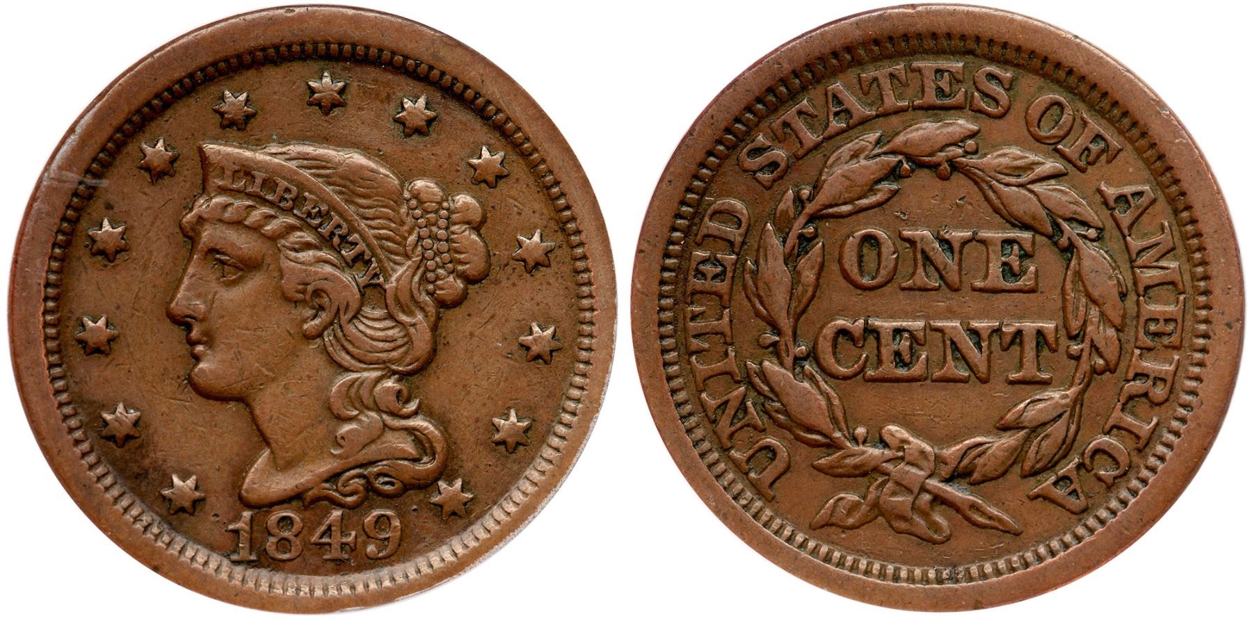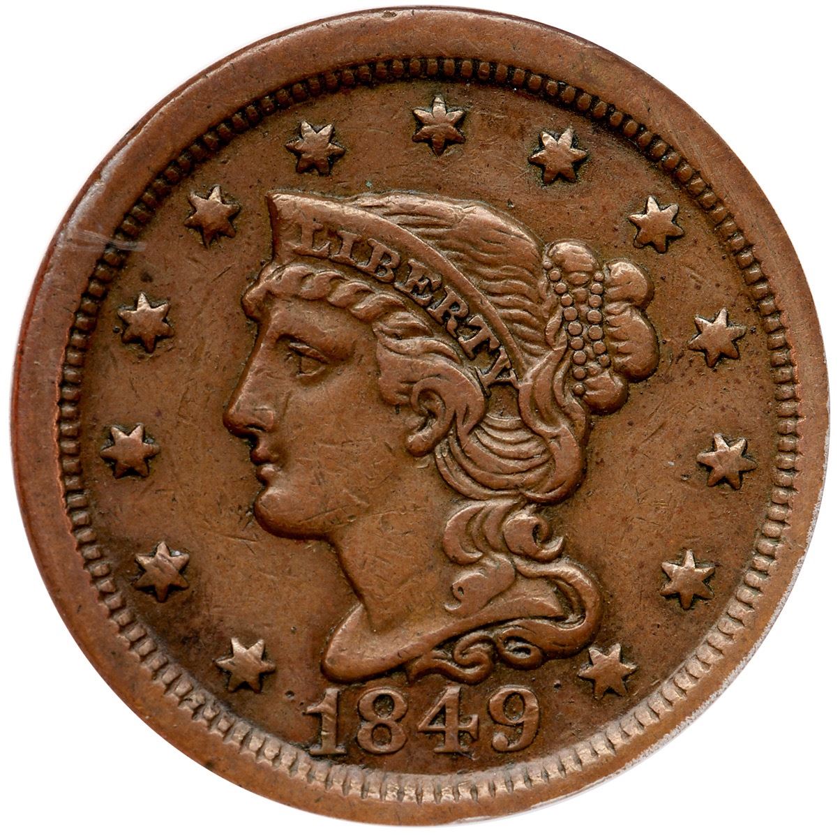 1849 N-7 R-3 ANACS VF30Light olive brown. There are a few trivial nicks on the portrait and fields, and traces of dark crud in some protected areas. Smooth surfaces. Our grade is VF25. 7341290