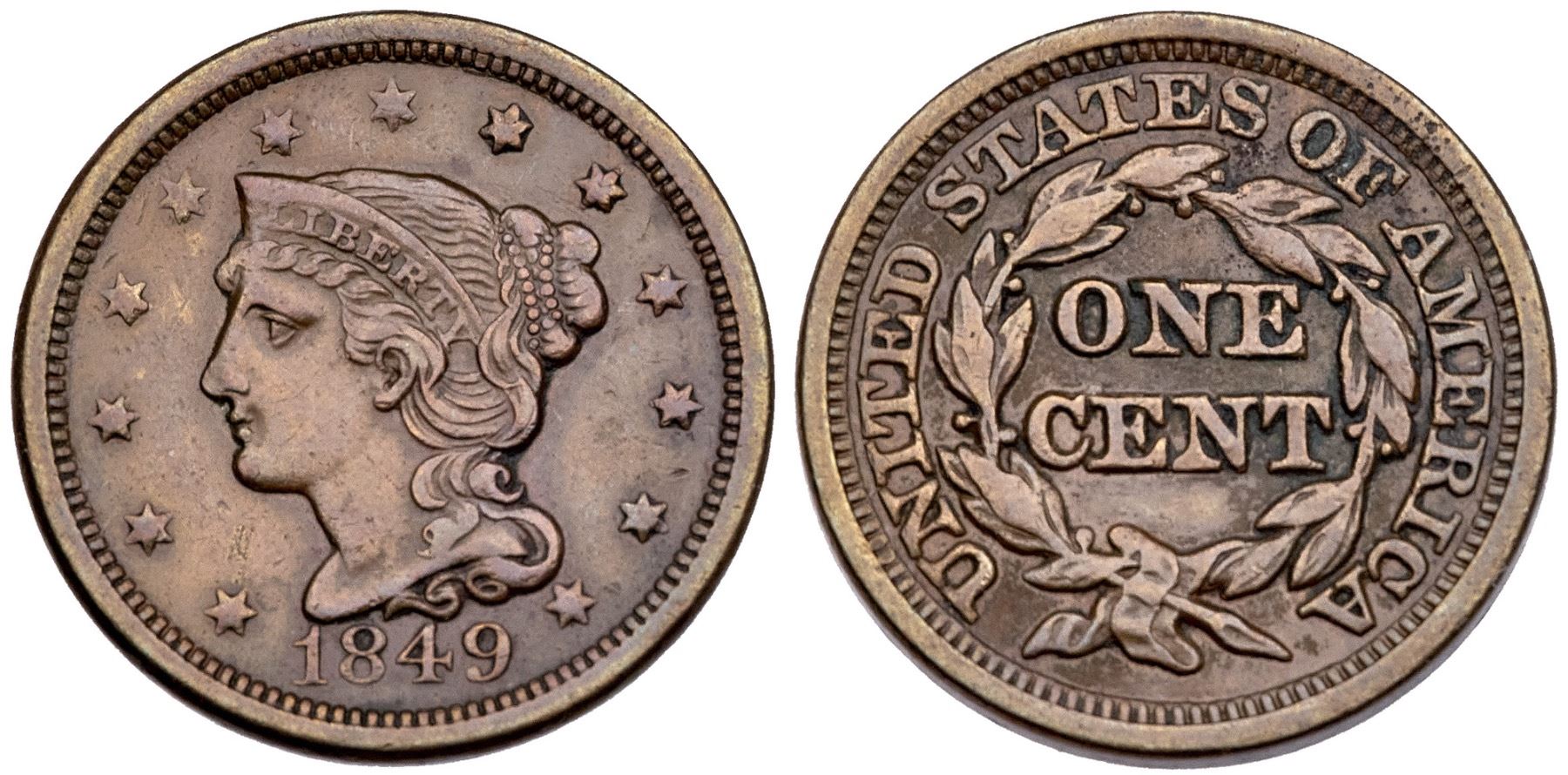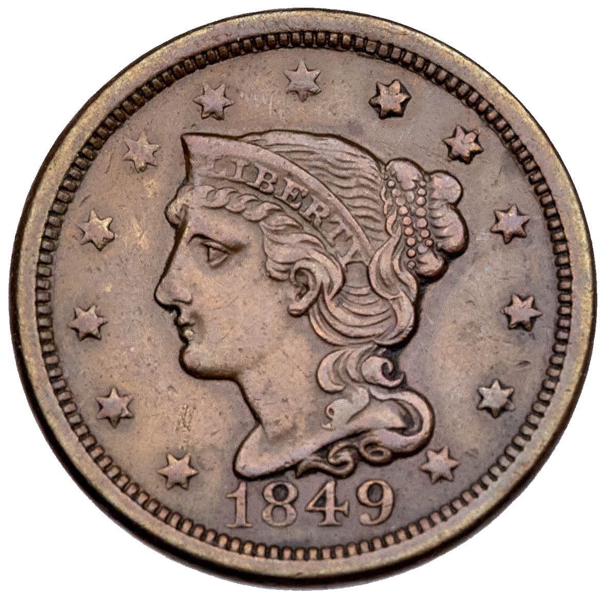 1849 N-9 R-4+ VF25Five points sharper but there is minor verdigris in some reverse protected areas. There are also trivial nicks in the fields. Glossy medium brown and olive. M-LDS, state f.