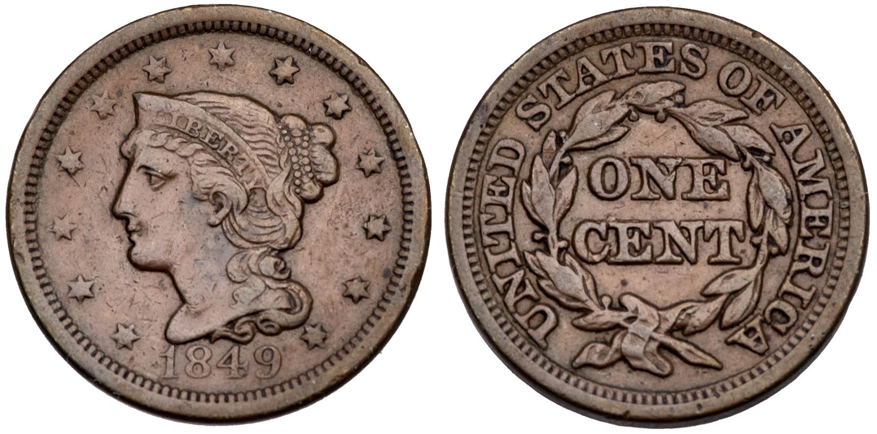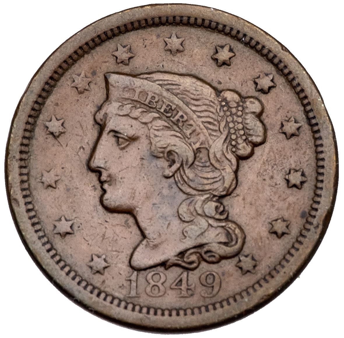 1849 N-9 R-4+ F15Ten points sharper but there are too many nicks for the higher grade. Glossy medium brown and chocolate. LDS. Ex; ELK Superior 10/2001:480 - CVM 12/2006